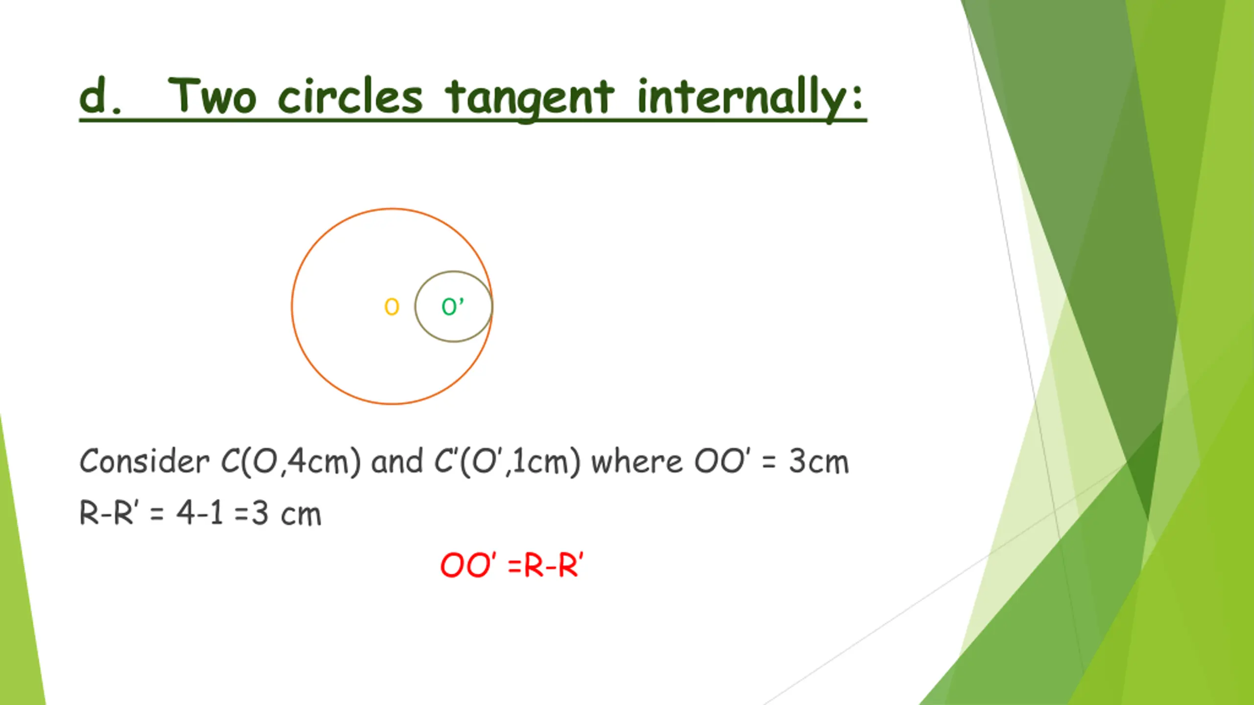 d. Two circles tangent internally: O O Consider C(O,4cm) and C (O ,1cm) where OO = 3cm R-R = 4-1 =3 cm OO =R-R