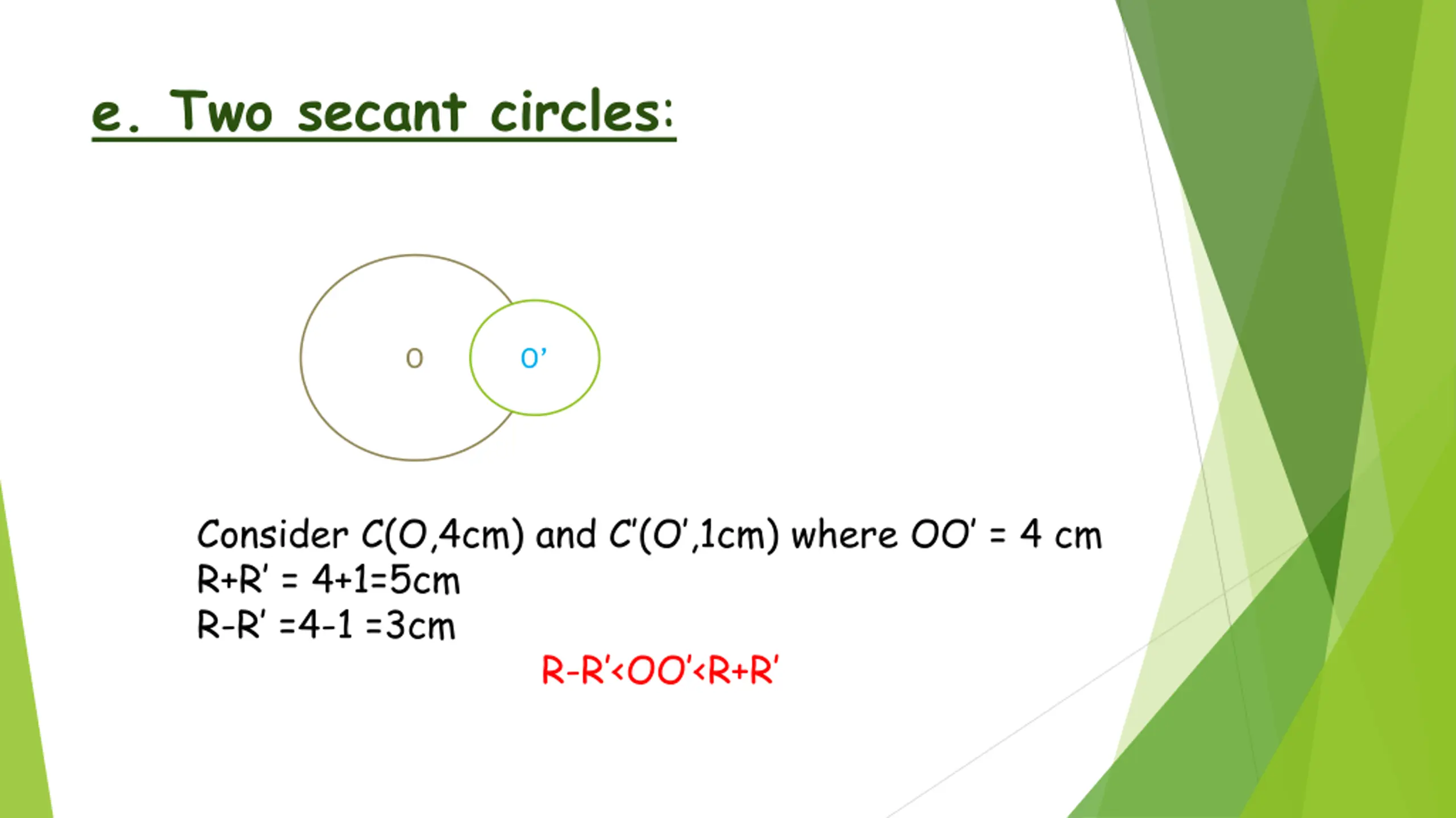 e. Two secant circles: O O Consider C(O,4cm) and C (O ,1cm) where OO = 4 cm R+R = 4+1=5cm R-R =4-1 =3cm R-R <OO <R+R