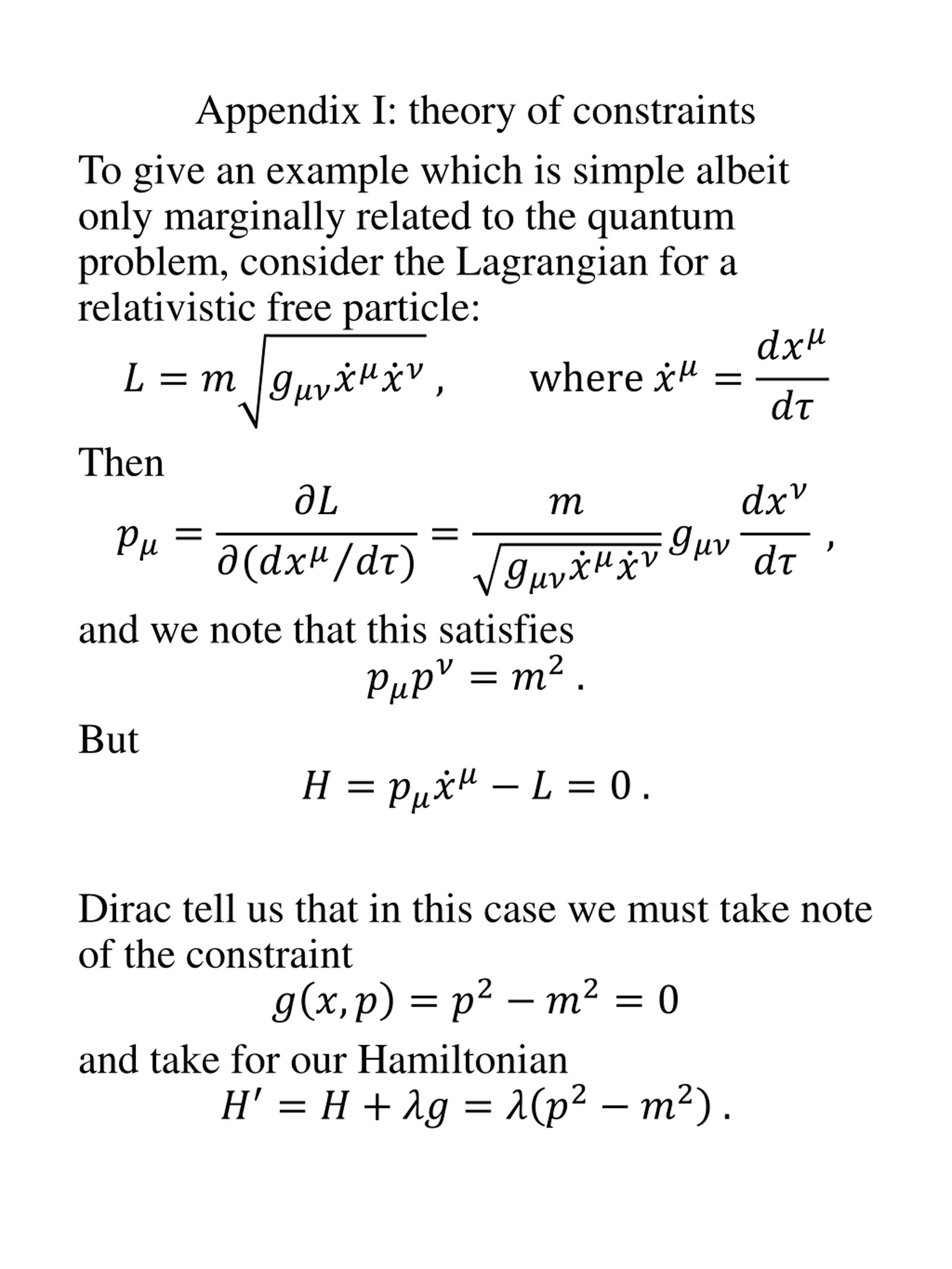 Appendix I: theory of constraints To give an example which is simple albeit only marginally related to the quantum problem, consider the Lagrangian for a relativistic free particle: where ??=??? ? = ? ??? ?? ??, ?? Then ??? ?? ?? ? ??= ?????)= ??? ?? ????? , ?( and we note that this satisfies ????= ?2. But ? = ?? ?? ? = 0 . Dirac tell us that in this case we must take note of the constraint ? ?,? = ?2 ?2= 0 and take for our Hamiltonian ? = ? + ?? = ? ?2 ?2.