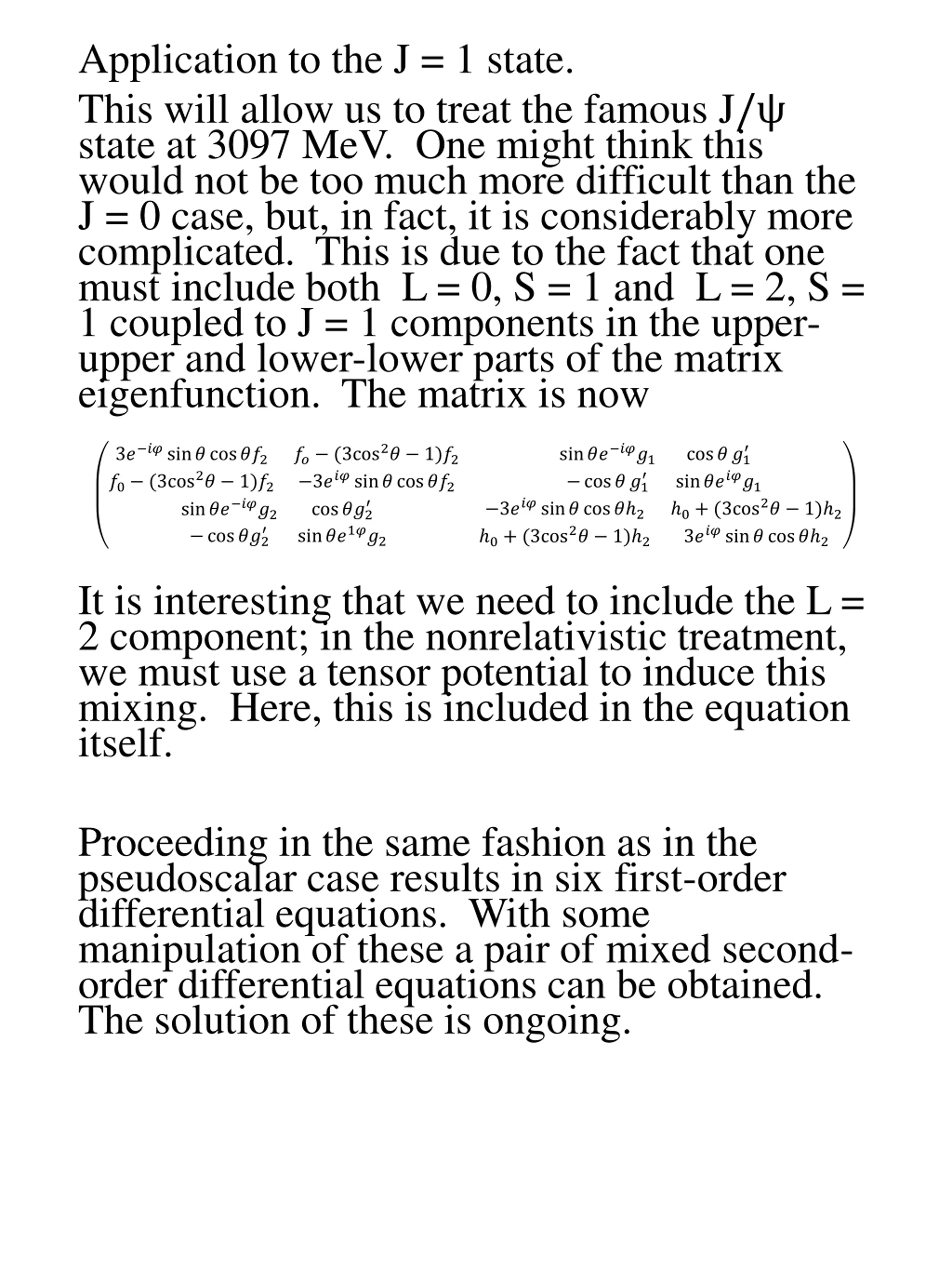 Application to the J = 1 state. This will allow us to treat the famous J/ state at 3097 MeV. One might think this would not be too much more difficult than the J = 0 case, but, in fact, it is considerably more complicated. This is due to the fact that one must include both L = 0, S = 1 and L = 2, S = 1 coupled to J = 1 components in the upper- upper and lower-lower parts of the matrix eigenfunction. The matrix is now 3? ??sin?cos??2 ?0 (3cos2? 1)?2 sin?? ???2 cos??2 ?? (3cos2? 1)?2 3???sin?cos??2 cos??2 sin??1??2 sin?? ???1 cos??1 cos??1 sin?????1 0+ (3cos2? 1) 2 3???sin? cos? 2 3???sin?cos? 2 0+ (3cos2? 1) 2 It is interesting that we need to include the L = 2 component; in the nonrelativistic treatment, we must use a tensor potential to induce this mixing. Here, this is included in the equation itself. Proceeding in the same fashion as in the pseudoscalar case results in six first-order differential equations. With some manipulation of these a pair of mixed second- order differential equations can be obtained. The solution of these is ongoing.