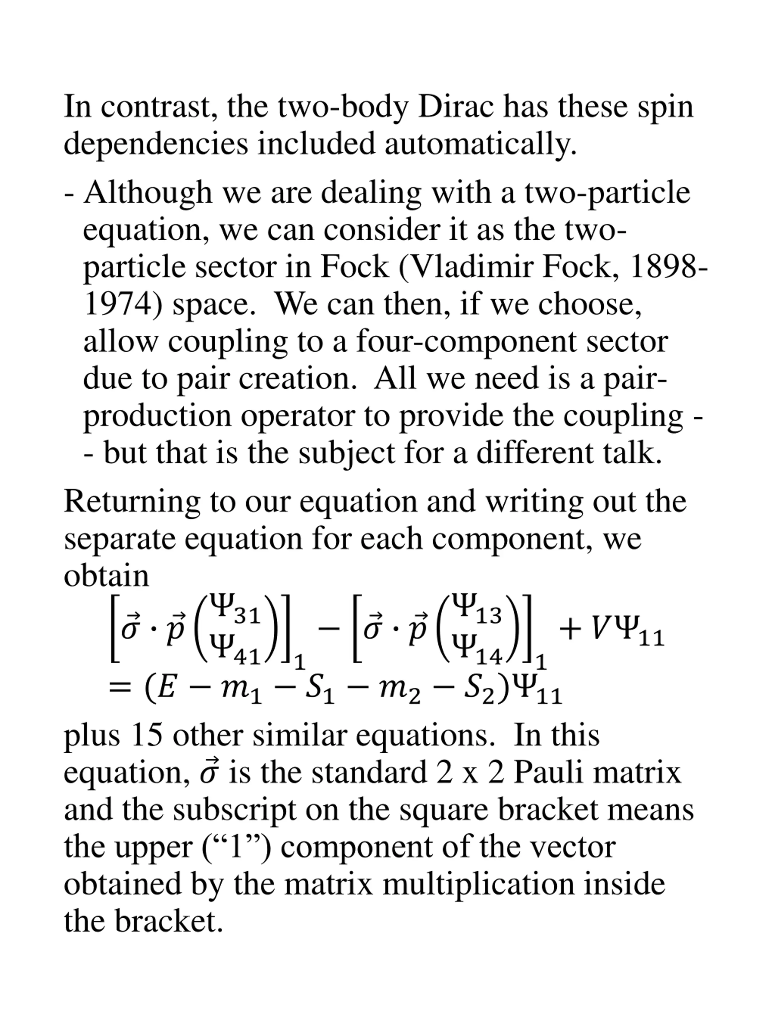 In contrast, the two-body Dirac has these spin dependencies included automatically. - Although we are dealing with a two-particle equation, we can consider it as the two- particle sector in Fock (Vladimir Fock, 1898- 1974) space. We can then, if we choose, allow coupling to a four-component sector due to pair creation. All we need is a pair- production operator to provide the coupling - - but that is the subject for a different talk. Returning to our equation and writing out the separate equation for each component, we obtain 31 41 1 = (? ?1 ?1 ?2 ?2) 11 plus 15 other similar equations. In this equation, ? is the standard 2 x 2 Pauli matrix and the subscript on the square bracket means the upper ( 1 ) component of the vector obtained by the matrix multiplication inside the bracket. 13 14 ? ? ? ? + ? 11 1