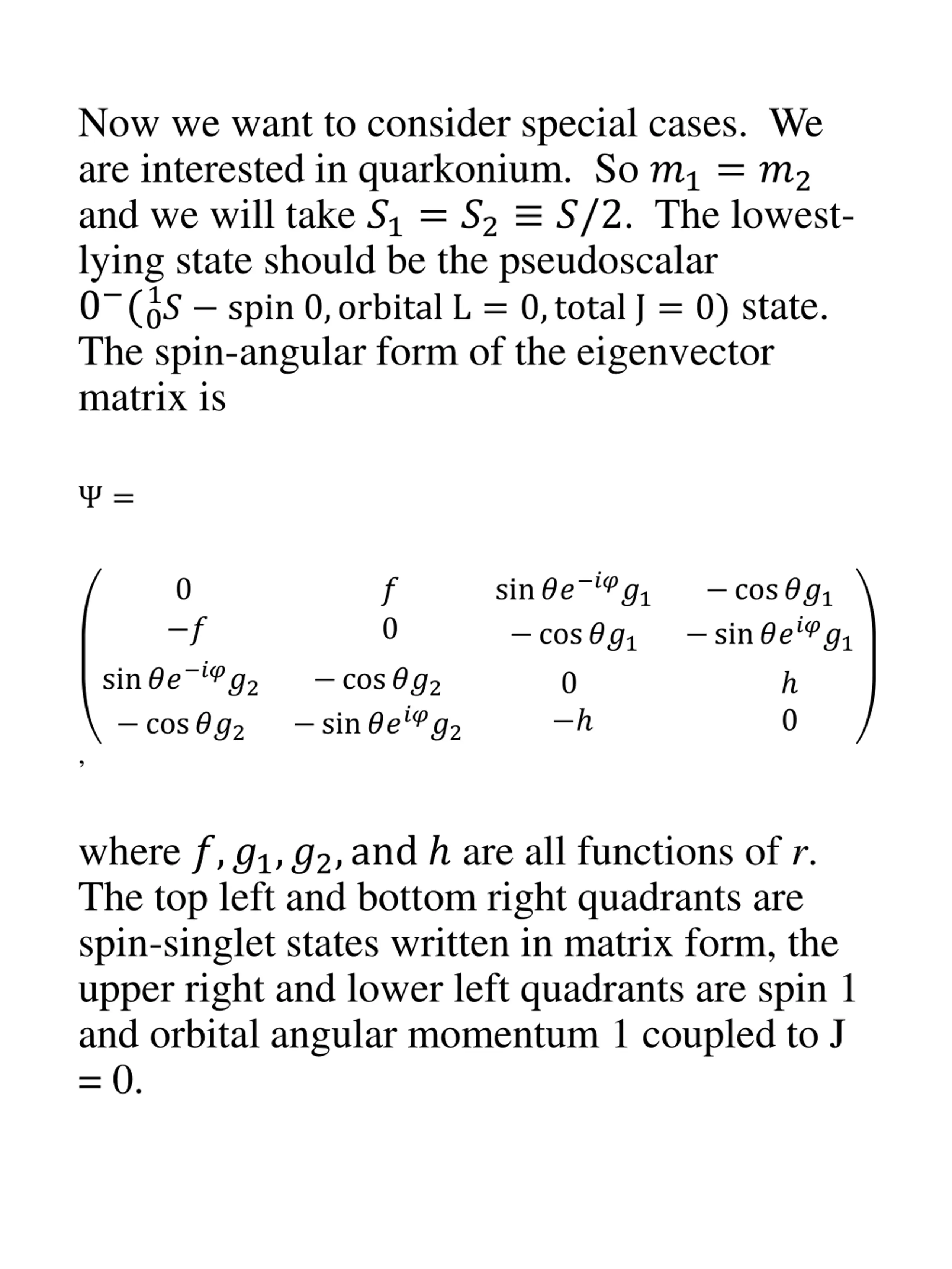 Now we want to consider special cases. We are interested in quarkonium. So ?1= ?2 and we will take ?1= ?2 ?/2. The lowest- lying state should be the pseudoscalar 0 (0 The spin-angular form of the eigenvector matrix is 1? spin 0,orbital L = 0,total J = 0) state. = sin?? ???1 cos??1 0 0 ? ? 0 cos??1 sin?????1 sin?? ???2 cos??2 cos??2 sin?????2 0 , where ?,?1,?2,and are all functions of r. The top left and bottom right quadrants are spin-singlet states written in matrix form, the upper right and lower left quadrants are spin 1 and orbital angular momentum 1 coupled to J = 0.