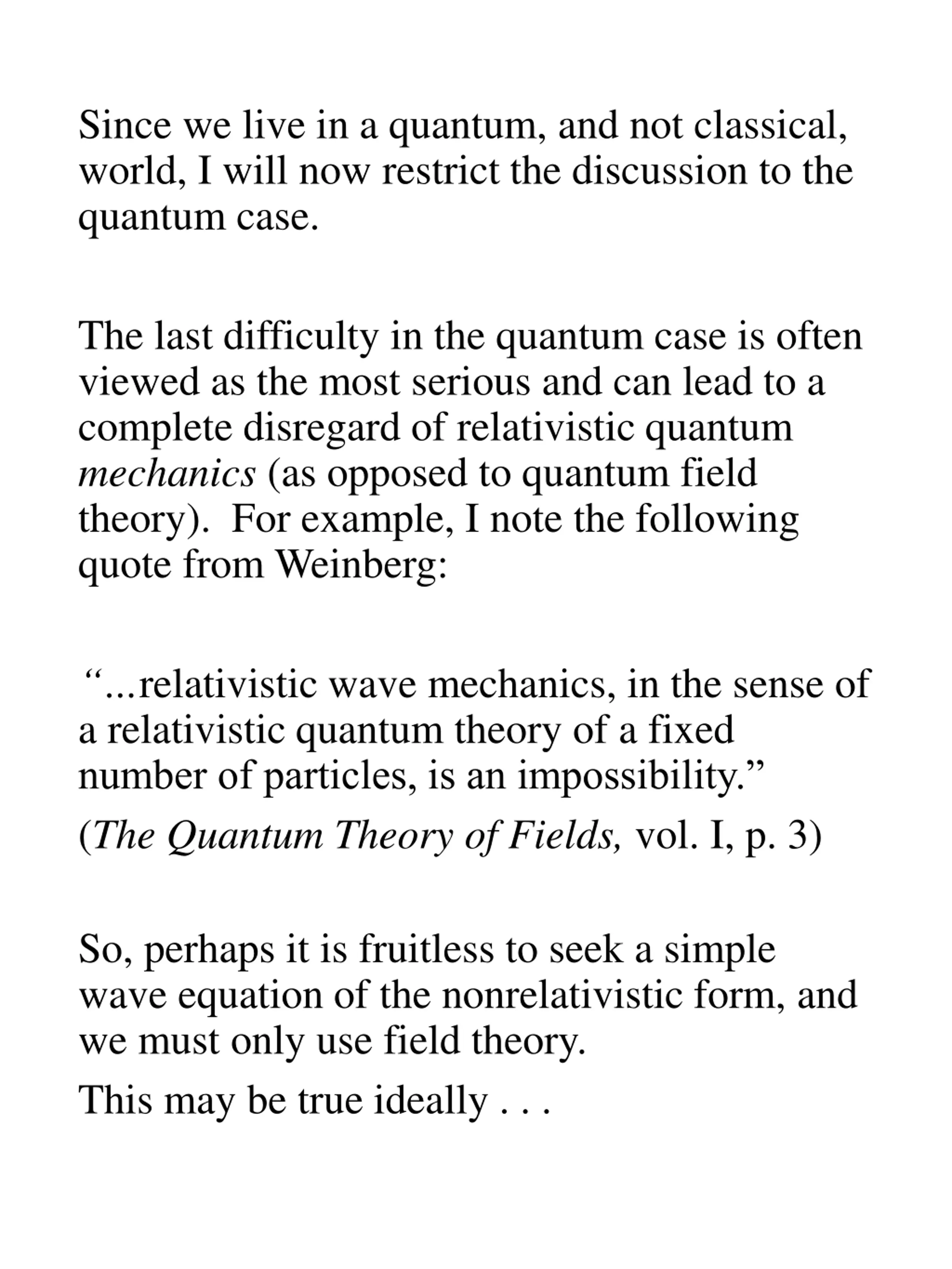 Since we live in a quantum, and not classical, world, I will now restrict the discussion to the quantum case. The last difficulty in the quantum case is often viewed as the most serious and can lead to a complete disregard of relativistic quantum mechanics (as opposed to quantum field theory). For example, I note the following quote from Weinberg: relativistic wave mechanics, in the sense of a relativistic quantum theory of a fixed number of particles, is an impossibility. (The Quantum Theory of Fields, vol. I, p. 3) So, perhaps it is fruitless to seek a simple wave equation of the nonrelativistic form, and we must only use field theory. This may be true ideally . . .