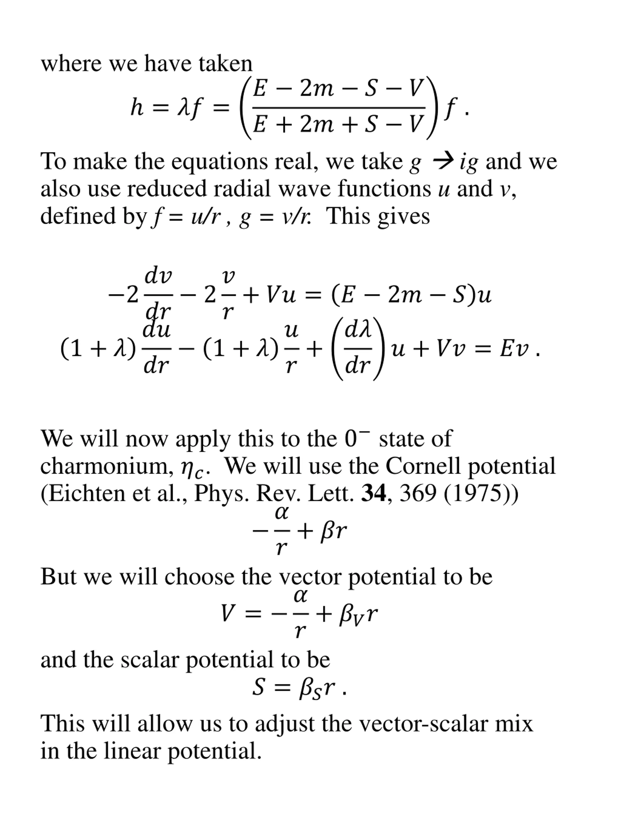 where we have taken ? 2? ? ? ? + 2? + ? ? = ?? = ? . To make the equations real, we take g ig and we also use reduced radial wave functions u and v, defined by f = u/r , g = v/r. This gives 2?? ?? 2? ?? ?? 1 + ? ?+ ?? = ? 2? ? ? ? ?+ ?? ?? 1 + ? ? + ?? = ?? . We will now apply this to the 0 state of charmonium, ??. We will use the Cornell potential (Eichten et al., Phys. Rev. Lett. 34, 369 (1975)) ? ?+ ?? But we will choose the vector potential to be ? = ? ?+ ??? and the scalar potential to be ? = ??? . This will allow us to adjust the vector-scalar mix in the linear potential.
