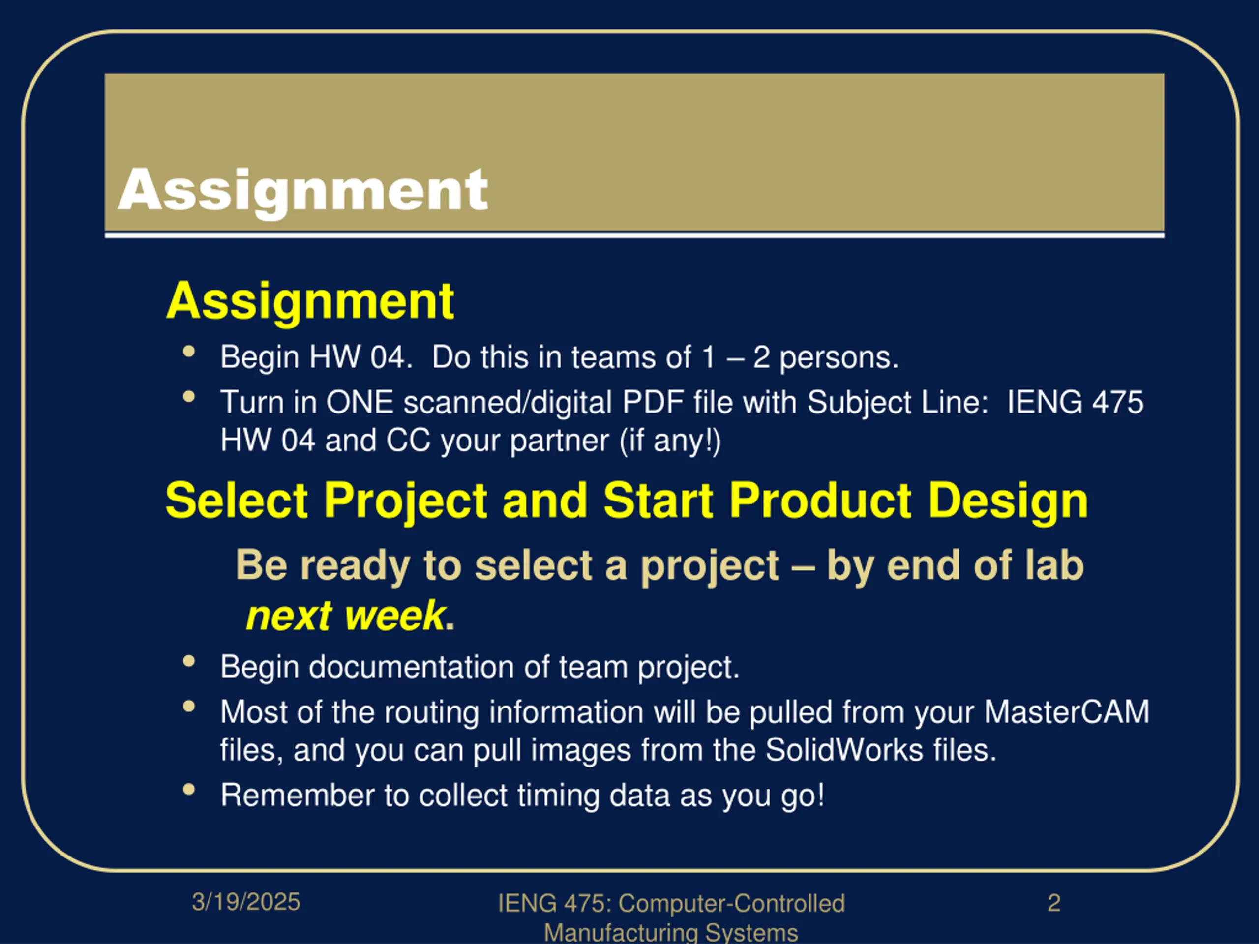 Assignment Assignment Begin HW 04. Do this in teams of 1 2 persons. Turn in ONE scanned/digital PDF file with Subject Line: IENG 475 HW 04 and CC your partner (if any!) Select Project and Start Product Design Be ready to select a project by end of lab next week. Begin documentation of team project. Most of the routing information will be pulled from your MasterCAM files, and you can pull images from the SolidWorks files. Remember to collect timing data as you go! 3/19/2025 2 IENG 475: Computer-Controlled Manufacturing Systems
