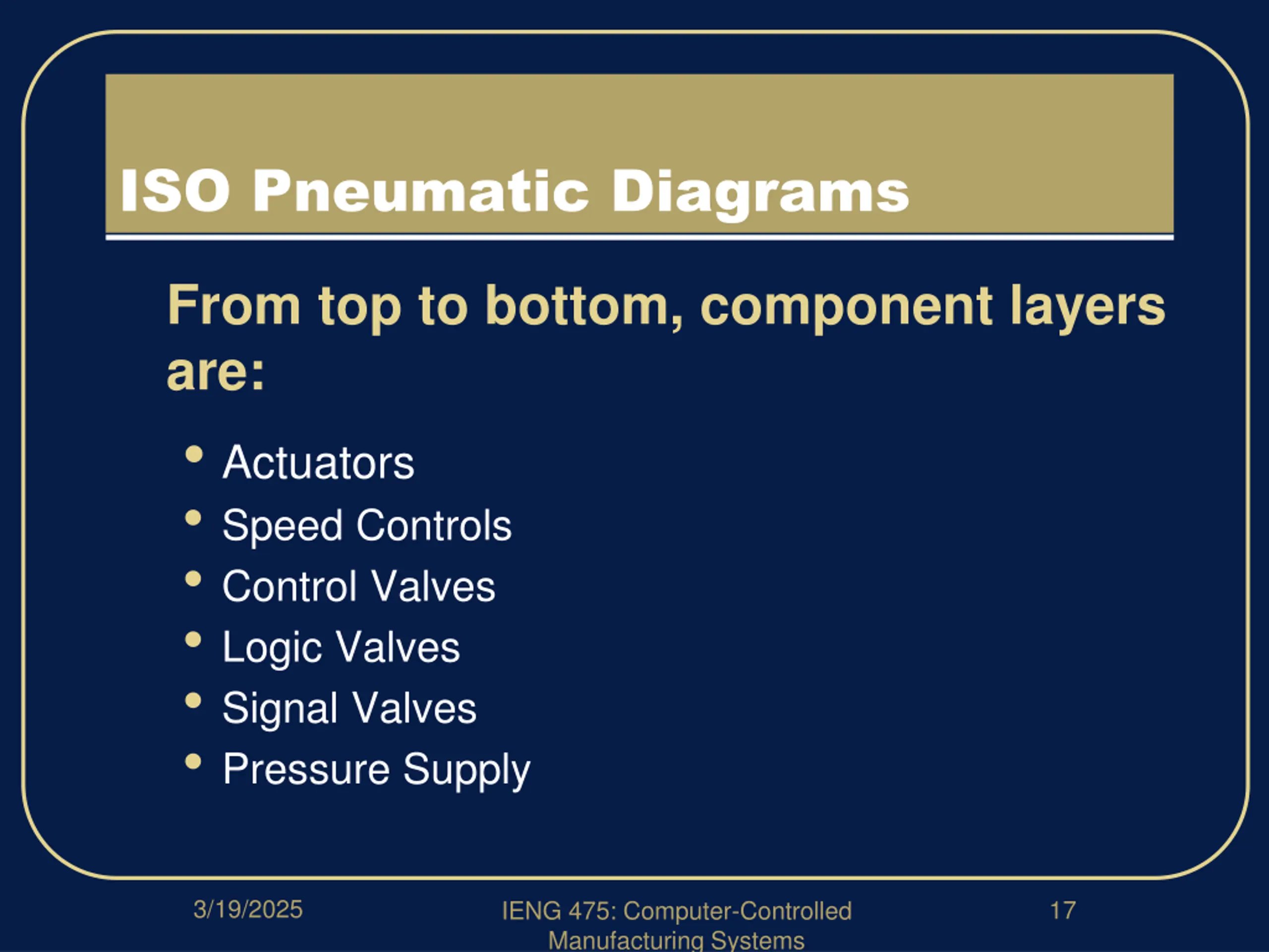 ISO Pneumatic Diagrams From top to bottom, component layers are: Actuators Speed Controls Control Valves Logic Valves Signal Valves Pressure Supply 3/19/2025 17 IENG 475: Computer-Controlled Manufacturing Systems
