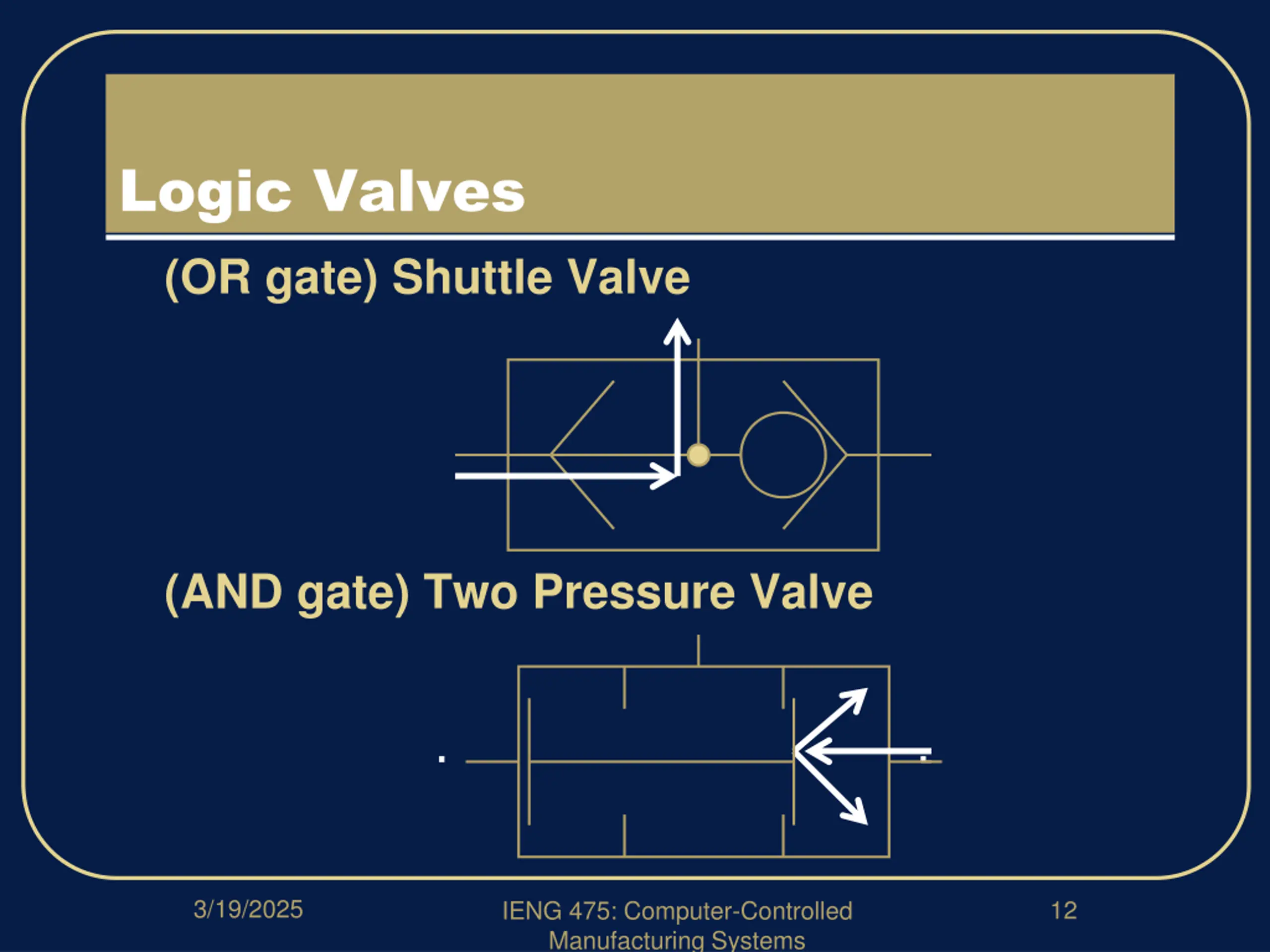 Logic Valves (OR gate) Shuttle Valve (AND gate) Two Pressure Valve 3/19/2025 12 IENG 475: Computer-Controlled Manufacturing Systems