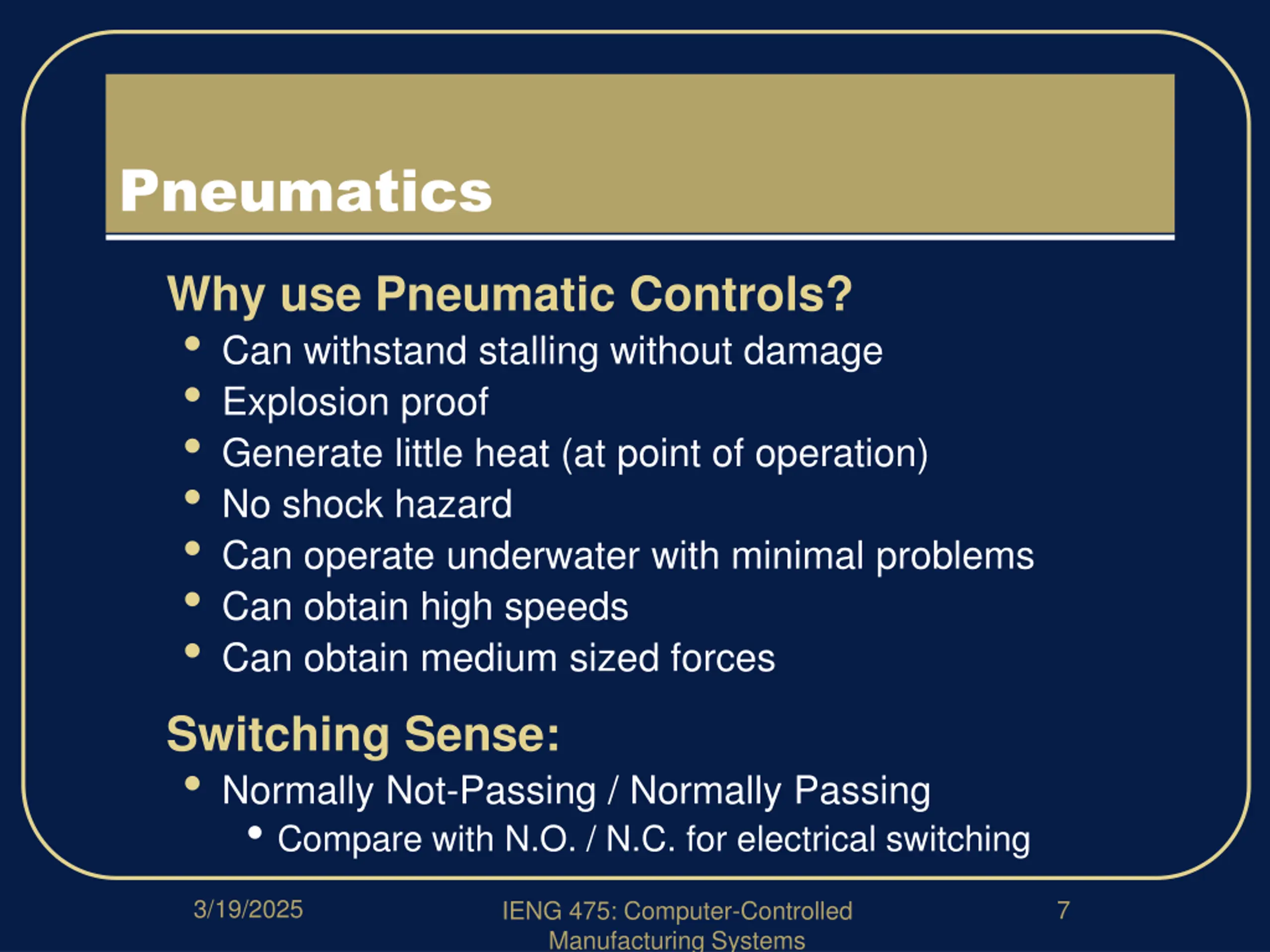 Pneumatics Why use Pneumatic Controls? Can withstand stalling without damage Explosion proof Generate little heat (at point of operation) No shock hazard Can operate underwater with minimal problems Can obtain high speeds Can obtain medium sized forces Switching Sense: Normally Not-Passing / Normally Passing Compare with N.O. / N.C. for electrical switching 3/19/2025 7 IENG 475: Computer-Controlled Manufacturing Systems