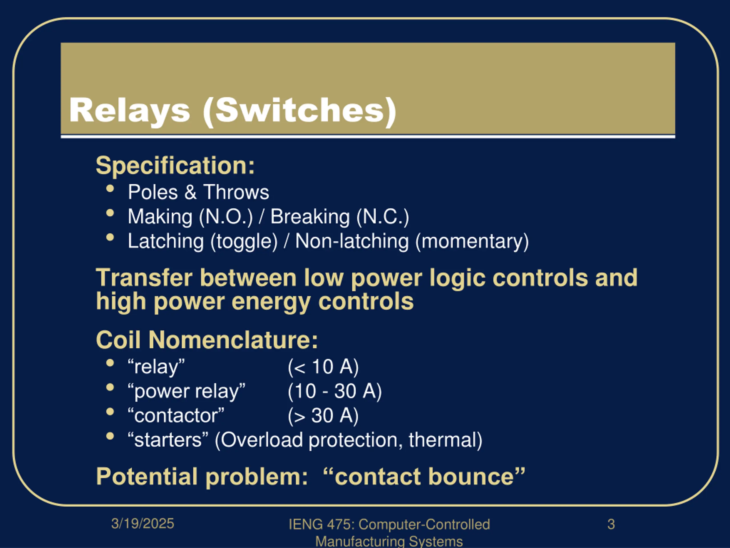 Relays (Switches) Specification: Poles & Throws Making (N.O.) / Breaking (N.C.) Latching (toggle) / Non-latching (momentary) Transfer between low power logic controls and high power energy controls Coil Nomenclature: relay power relay contactor starters (Overload protection, thermal) (< 10 A) (10 - 30 A) (> 30 A) Potential problem: contact bounce 3/19/2025 3 IENG 475: Computer-Controlled Manufacturing Systems