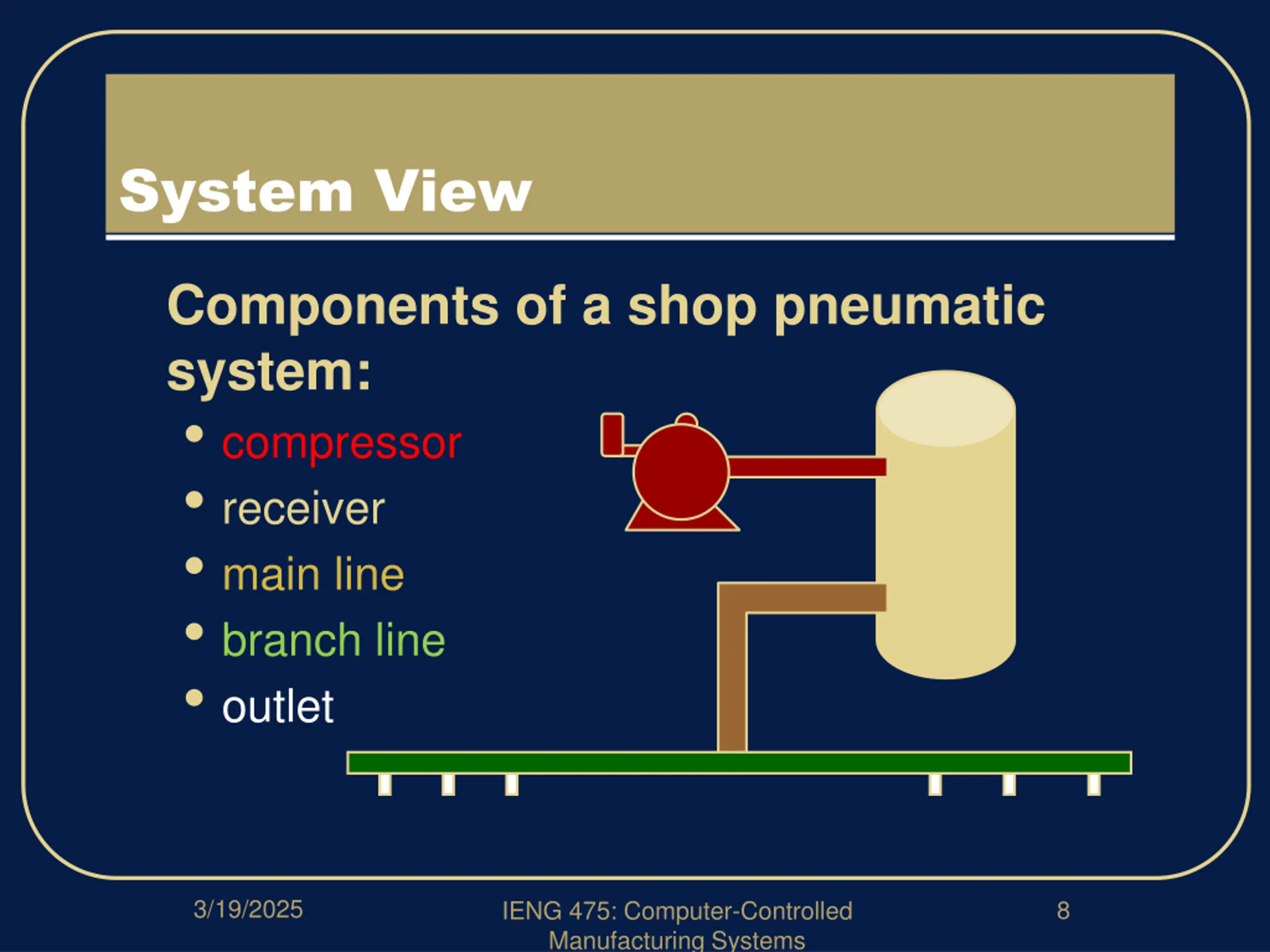 System View Components of a shop pneumatic system: compressor receiver main line branch line outlet 3/19/2025 8 IENG 475: Computer-Controlled Manufacturing Systems