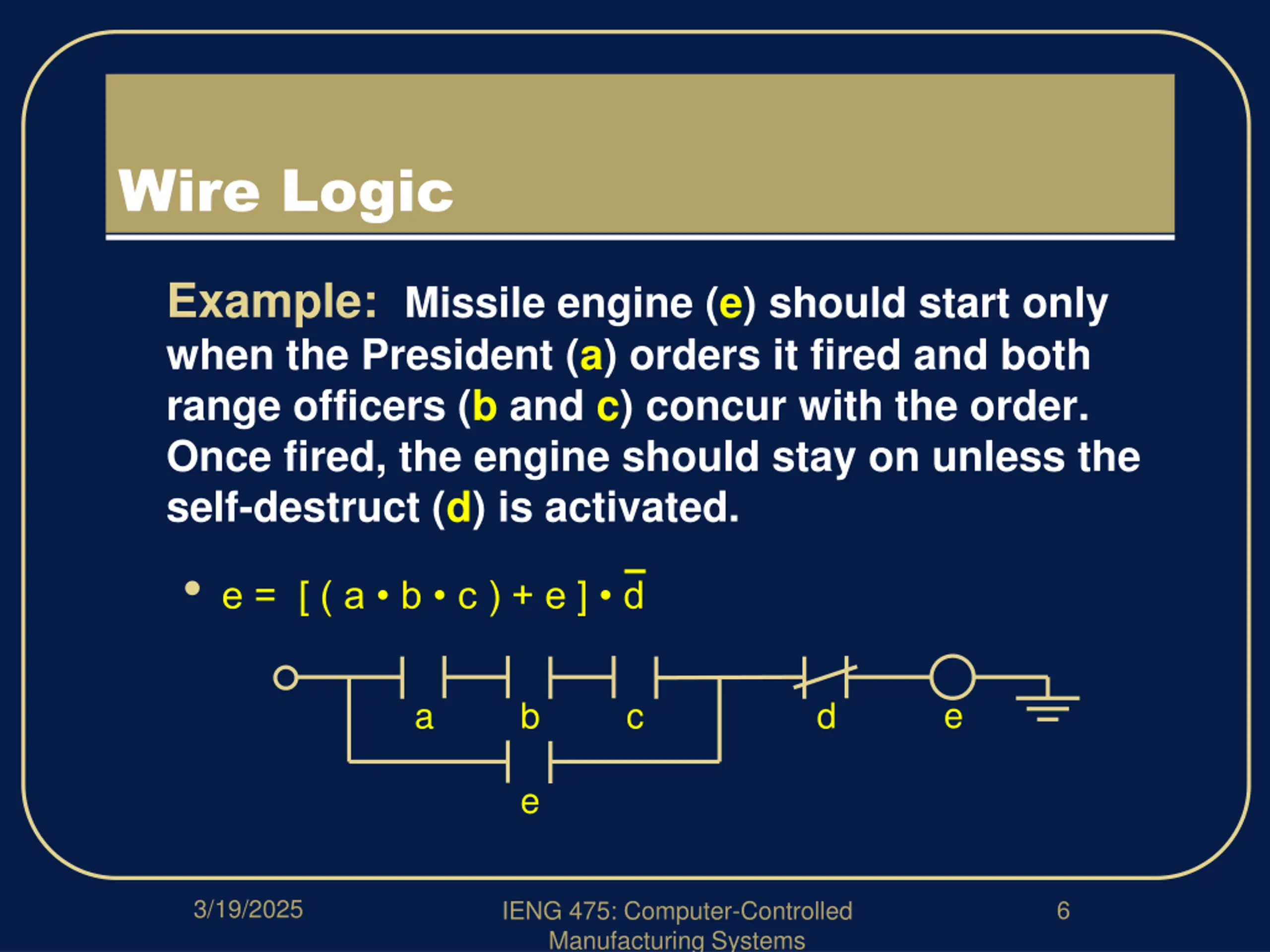 Wire Logic Example: Missile engine (e) should start only when the President (a) orders it fired and both range officers (b and c) concur with the order. Once fired, the engine should stay on unless the self-destruct (d) is activated. e = [ ( a b c ) + e ] d e a b c d e 3/19/2025 6 IENG 475: Computer-Controlled Manufacturing Systems