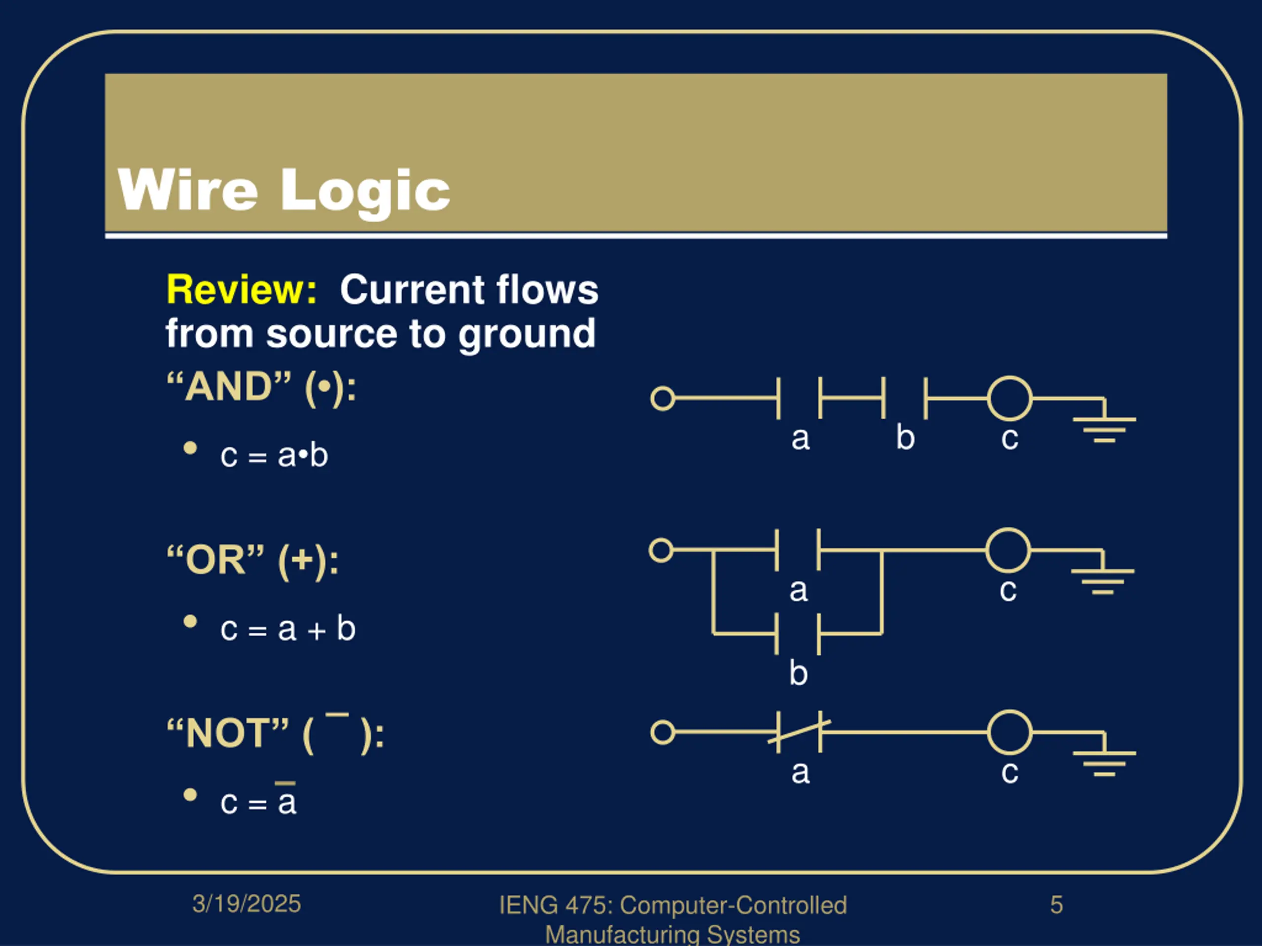 Wire Logic Review: Current flows from source to ground AND ( ): c = a b a b c OR (+): c = a + b a c b NOT ( ): c = a a c 3/19/2025 5 IENG 475: Computer-Controlled Manufacturing Systems
