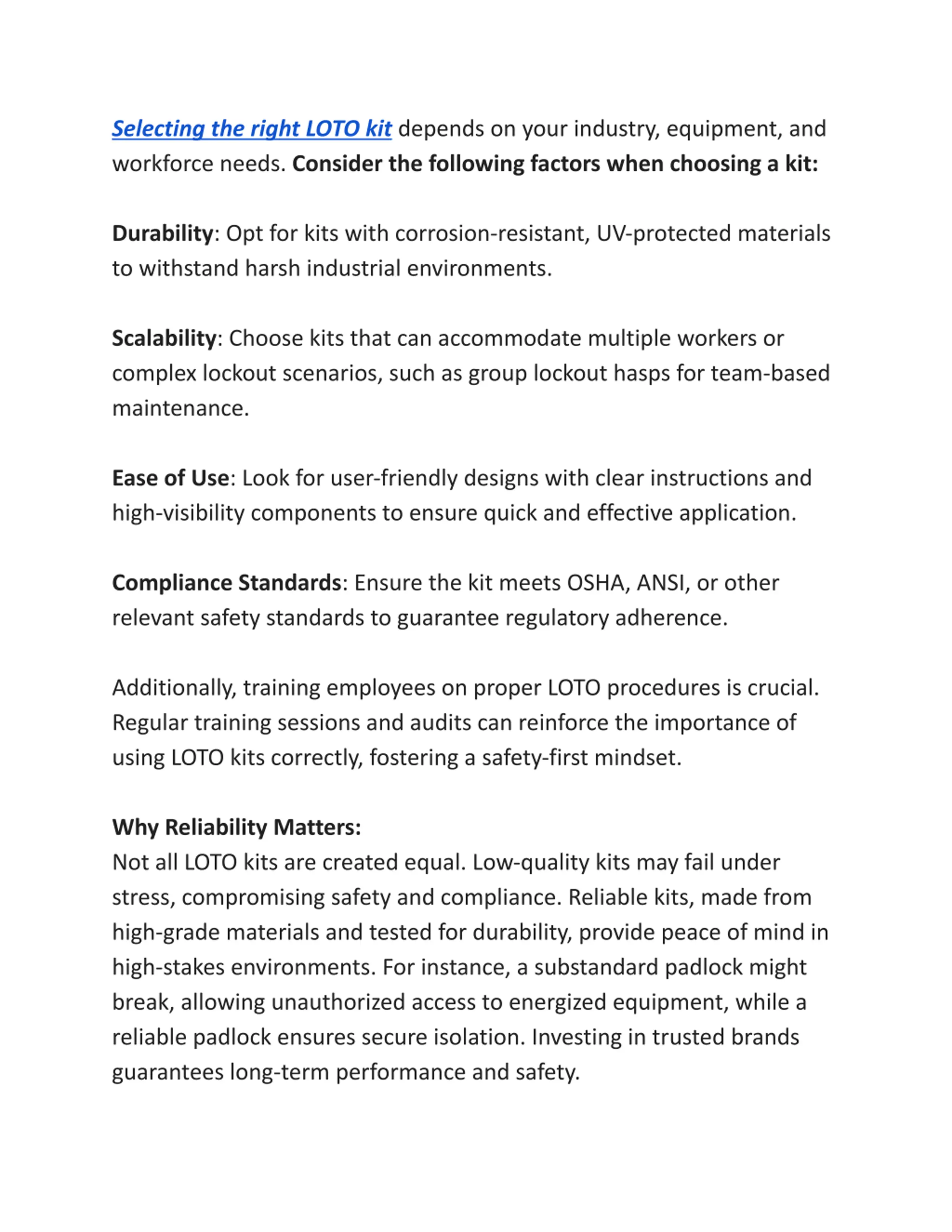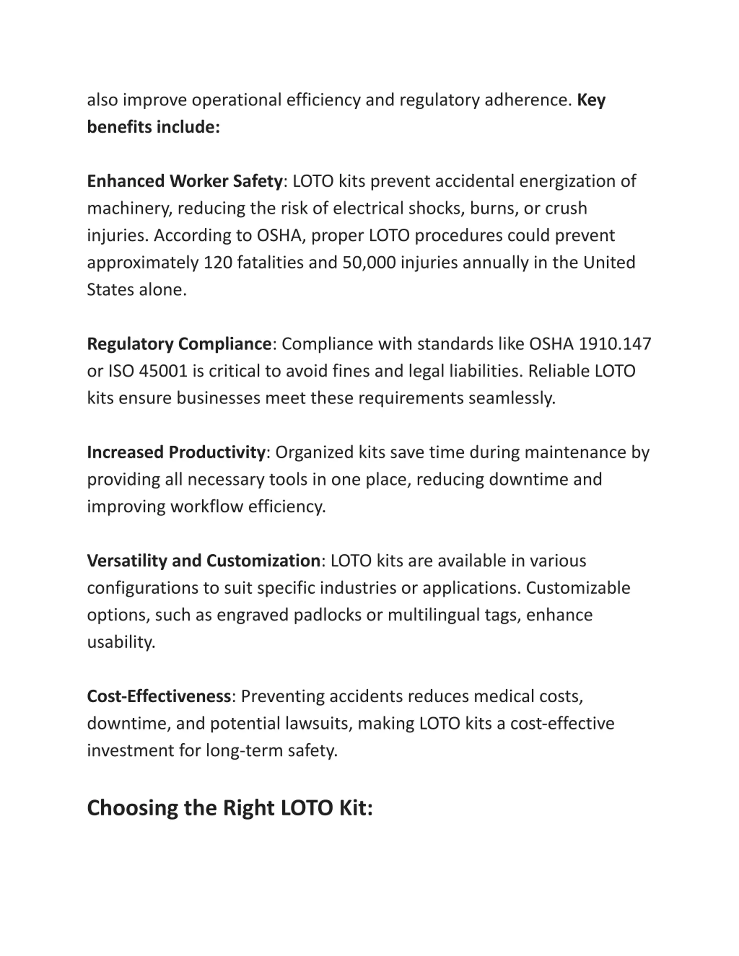also improve operational efficiency and regulatory adherence. Key benefits include: Enhanced Worker Safety: LOTO kits prevent accidental energization of machinery, reducing the risk of electrical shocks, burns, or crush injuries. According to OSHA, proper LOTO procedures could prevent approximately 120 fatalities and 50,000 injuries annually in the United States alone. Regulatory Compliance: Compliance with standards like OSHA 1910.147 or ISO 45001 is critical to avoid fines and legal liabilities. Reliable LOTO kits ensure businesses meet these requirements seamlessly. Increased Productivity: Organized kits save time during maintenance by providing all necessary tools in one place, reducing downtime and improving workflow efficiency. Versatility and Customization: LOTO kits are available in various configurations to suit specific industries or applications. Customizable options, such as engraved padlocks or multilingual tags, enhance usability. Cost-Effectiveness: Preventing accidents reduces medical costs, downtime, and potential lawsuits, making LOTO kits a cost-effective investment for long-term safety. Choosing the Right LOTO Kit: