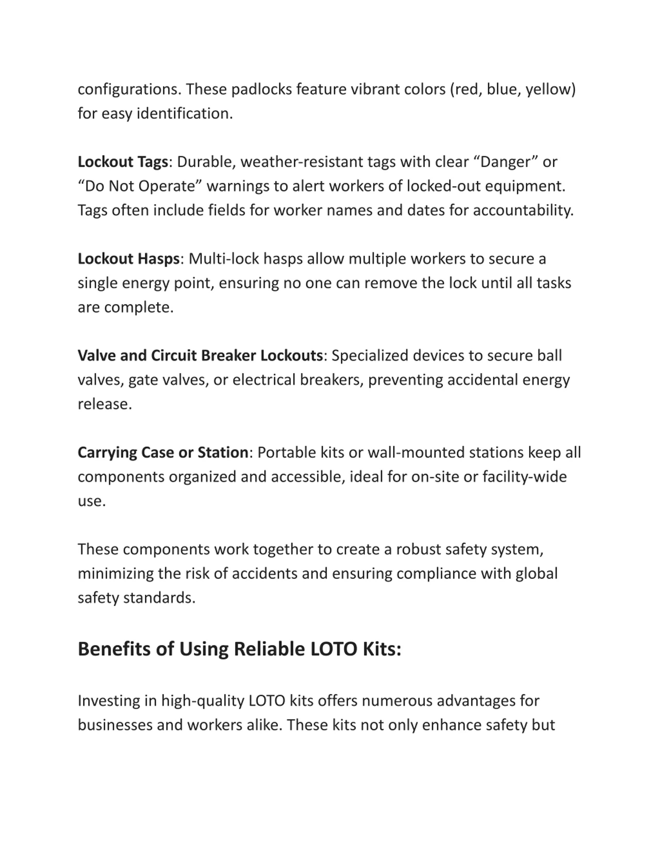 configurations. These padlocks feature vibrant colors (red, blue, yellow) for easy identification. Lockout Tags: Durable, weather-resistant tags with clear Danger or Do Not Operate warnings to alert workers of locked-out equipment. Tags often include fields for worker names and dates for accountability. Lockout Hasps: Multi-lock hasps allow multiple workers to secure a single energy point, ensuring no one can remove the lock until all tasks are complete. Valve and Circuit Breaker Lockouts: Specialized devices to secure ball valves, gate valves, or electrical breakers, preventing accidental energy release. Carrying Case or Station: Portable kits or wall-mounted stations keep all components organized and accessible, ideal for on-site or facility-wide use. These components work together to create a robust safety system, minimizing the risk of accidents and ensuring compliance with global safety standards. Benefits of Using Reliable LOTO Kits: Investing in high-quality LOTO kits offers numerous advantages for businesses and workers alike. These kits not only enhance safety but