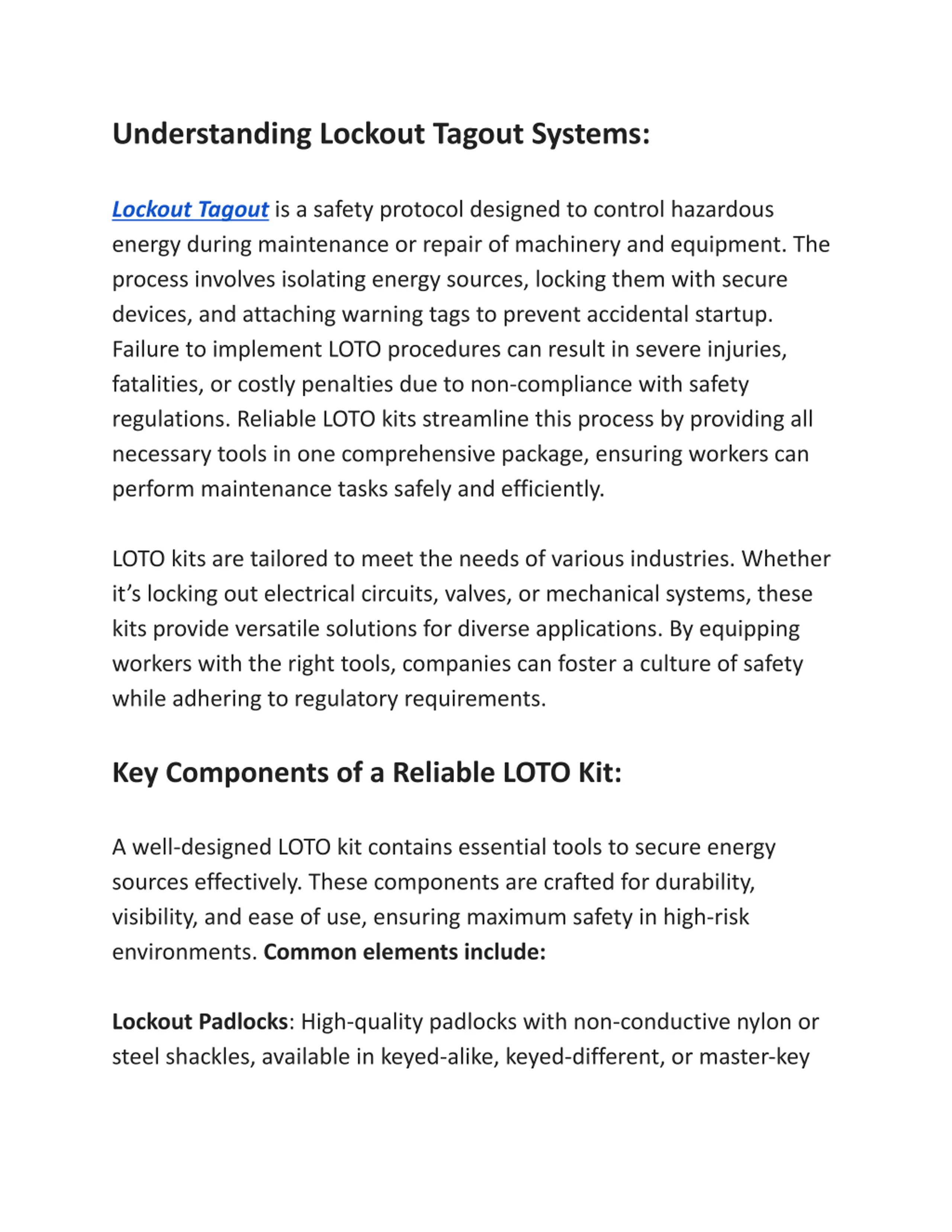 Understanding Lockout Tagout Systems: Lockout Tagout is a safety protocol designed to control hazardous energy during maintenance or repair of machinery and equipment. The process involves isolating energy sources, locking them with secure devices, and attaching warning tags to prevent accidental startup. Failure to implement LOTO procedures can result in severe injuries, fatalities, or costly penalties due to non-compliance with safety regulations. Reliable LOTO kits streamline this process by providing all necessary tools in one comprehensive package, ensuring workers can perform maintenance tasks safely and efficiently. LOTO kits are tailored to meet the needs of various industries. Whether it s locking out electrical circuits, valves, or mechanical systems, these kits provide versatile solutions for diverse applications. By equipping workers with the right tools, companies can foster a culture of safety while adhering to regulatory requirements. Key Components of a Reliable LOTO Kit: A well-designed LOTO kit contains essential tools to secure energy sources effectively. These components are crafted for durability, visibility, and ease of use, ensuring maximum safety in high-risk environments. Common elements include: Lockout Padlocks: High-quality padlocks with non-conductive nylon or steel shackles, available in keyed-alike, keyed-different, or master-key
