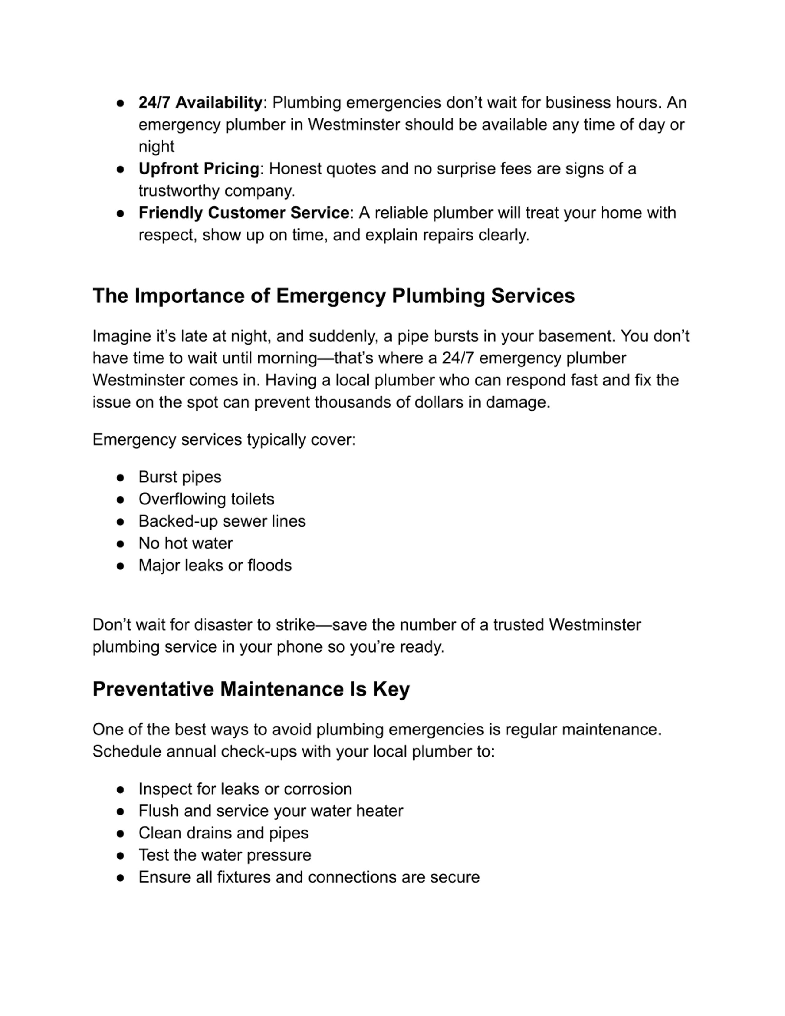 24/7 Availability: Plumbing emergencies dont wait for business hours. An emergency plumber in Westminster should be available any time of day or night Upfront Pricing: Honest quotes and no surprise fees are signs of a trustworthy company. Friendly Customer Service: A reliable plumber will treat your home with respect, show up on time, and explain repairs clearly. The Importance of Emergency Plumbing Services Imagine it s late at night, and suddenly, a pipe bursts in your basement. You don t have time to wait until morning that s where a 24/7 emergency plumber Westminster comes in. Having a local plumber who can respond fast and fix the issue on the spot can prevent thousands of dollars in damage. Emergency services typically cover: Burst pipes Overflowing toilets Backed-up sewer lines No hot water Major leaks or floods Don t wait for disaster to strike save the number of a trusted Westminster plumbing service in your phone so you re ready. Preventative Maintenance Is Key One of the best ways to avoid plumbing emergencies is regular maintenance. Schedule annual check-ups with your local plumber to: Inspect for leaks or corrosion Flush and service your water heater Clean drains and pipes Test the water pressure Ensure all fixtures and connections are secure