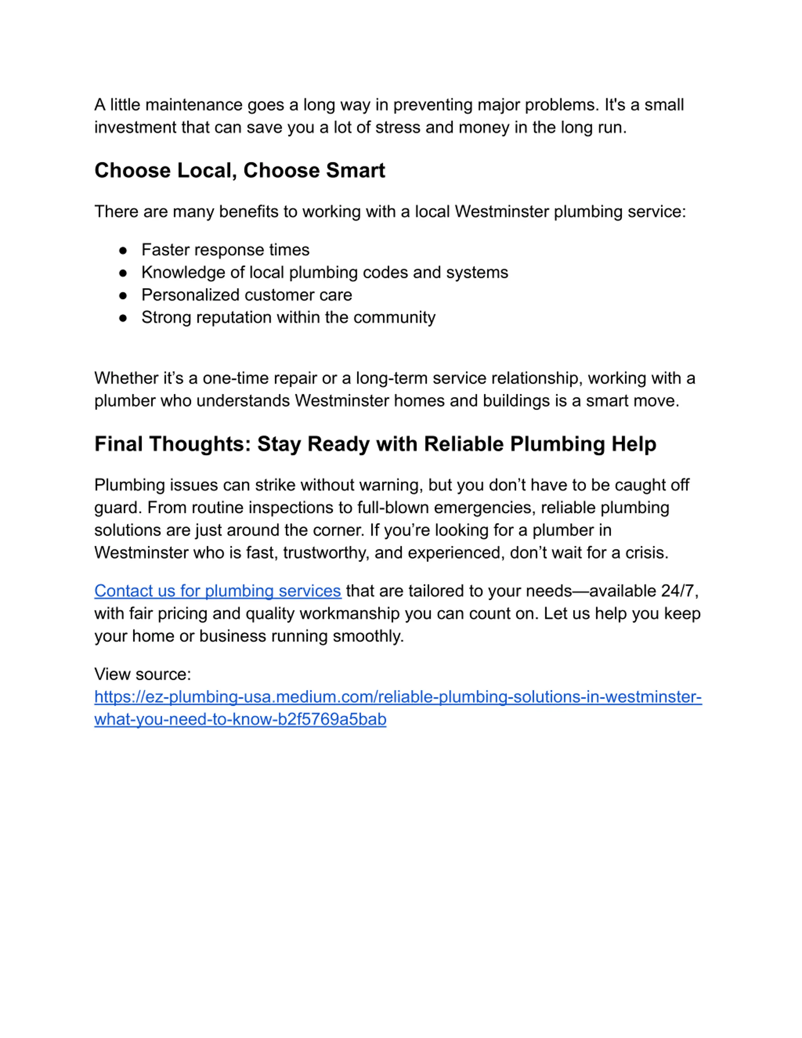 A little maintenance goes a long way in preventing major problems. It's a small investment that can save you a lot of stress and money in the long run. Choose Local, Choose Smart There are many benefits to working with a local Westminster plumbing service: Faster response times Knowledge of local plumbing codes and systems Personalized customer care Strong reputation within the community Whether it s a one-time repair or a long-term service relationship, working with a plumber who understands Westminster homes and buildings is a smart move. Final Thoughts: Stay Ready with Reliable Plumbing Help Plumbing issues can strike without warning, but you don t have to be caught off guard. From routine inspections to full-blown emergencies, reliable plumbing solutions are just around the corner. If you re looking for a plumber in Westminster who is fast, trustworthy, and experienced, don t wait for a crisis. Contact us for plumbing services that are tailored to your needs available 24/7, with fair pricing and quality workmanship you can count on. Let us help you keep your home or business running smoothly. View source: https://ez-plumbing-usa.medium.com/reliable-plumbing-solutions-in-westminster- what-you-need-to-know-b2f5769a5bab