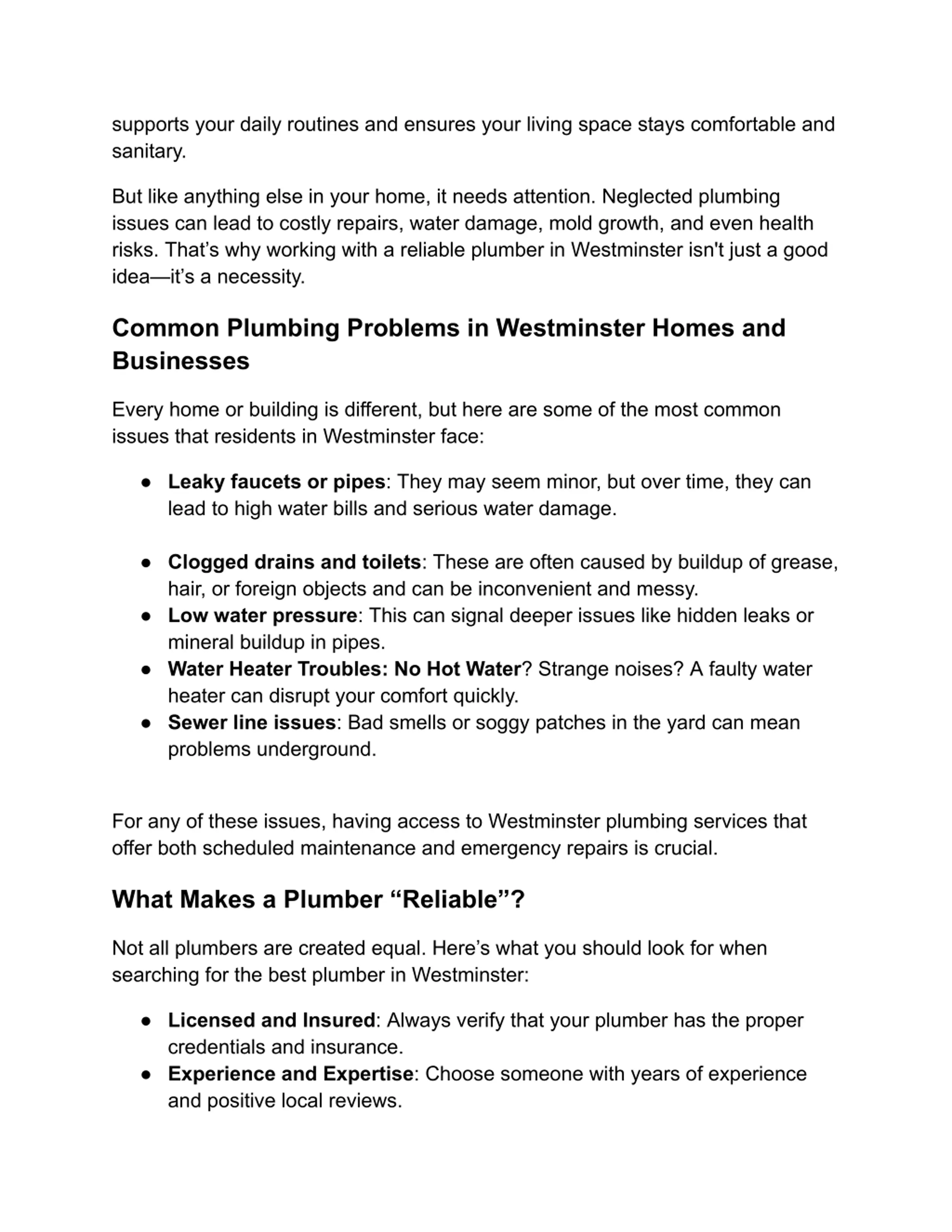 supports your daily routines and ensures your living space stays comfortable and sanitary. But like anything else in your home, it needs attention. Neglected plumbing issues can lead to costly repairs, water damage, mold growth, and even health risks. That s why working with a reliable plumber in Westminster isn't just a good idea it s a necessity. Common Plumbing Problems in Westminster Homes and Businesses Every home or building is different, but here are some of the most common issues that residents in Westminster face: Leaky faucets or pipes: They may seem minor, but over time, they can lead to high water bills and serious water damage. Clogged drains and toilets: These are often caused by buildup of grease, hair, or foreign objects and can be inconvenient and messy. Low water pressure: This can signal deeper issues like hidden leaks or mineral buildup in pipes. Water Heater Troubles: No Hot Water? Strange noises? A faulty water heater can disrupt your comfort quickly. Sewer line issues: Bad smells or soggy patches in the yard can mean problems underground. For any of these issues, having access to Westminster plumbing services that offer both scheduled maintenance and emergency repairs is crucial. What Makes a Plumber Reliable ? Not all plumbers are created equal. Here s what you should look for when searching for the best plumber in Westminster: Licensed and Insured: Always verify that your plumber has the proper credentials and insurance. Experience and Expertise: Choose someone with years of experience and positive local reviews.