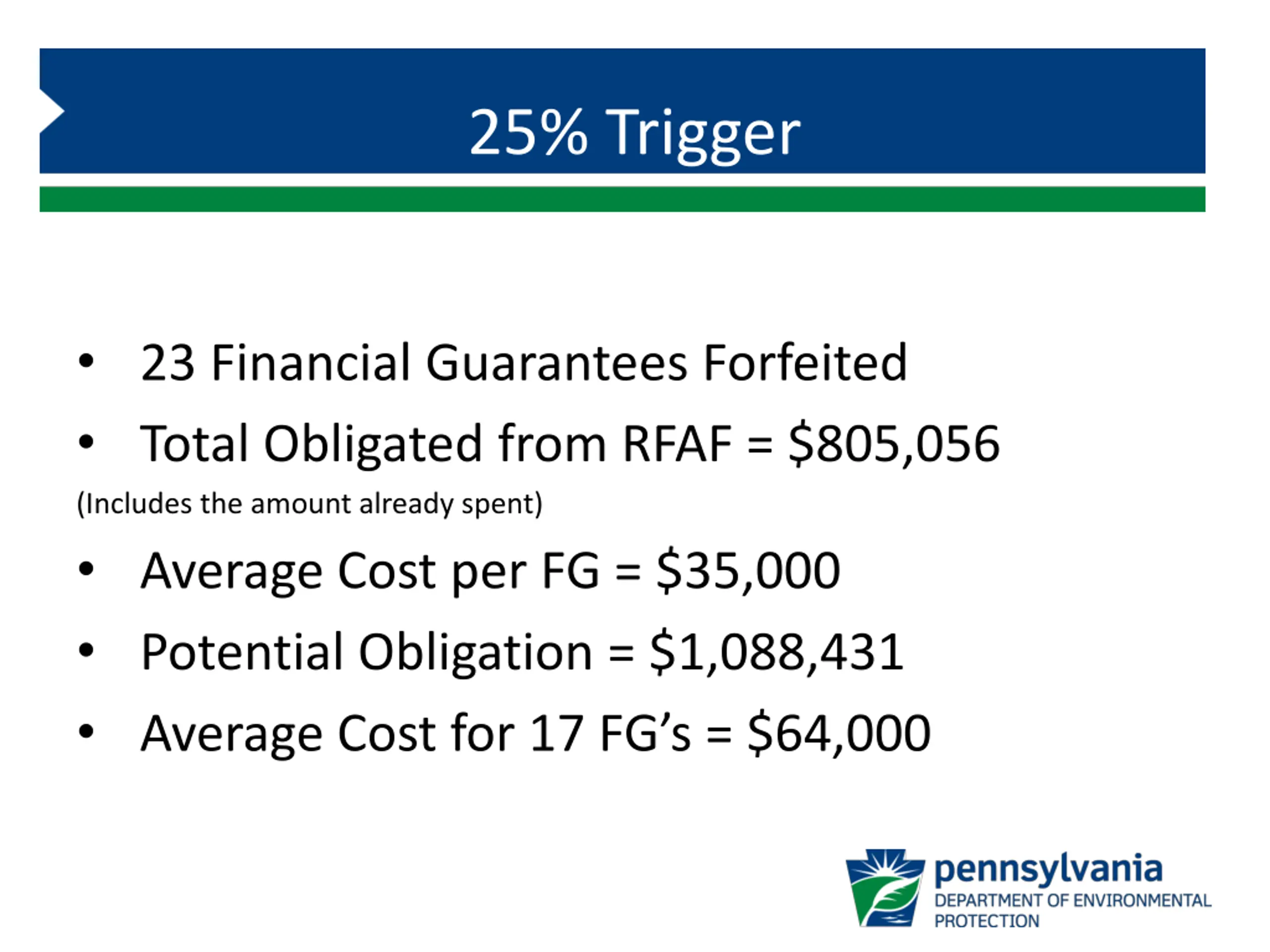 25% Trigger 23 Financial Guarantees Forfeited Total Obligated from RFAF = $805,056 (Includes the amount already spent) Average Cost per FG = $35,000 Potential Obligation = $1,088,431 Average Cost for 17 FG s = $64,000