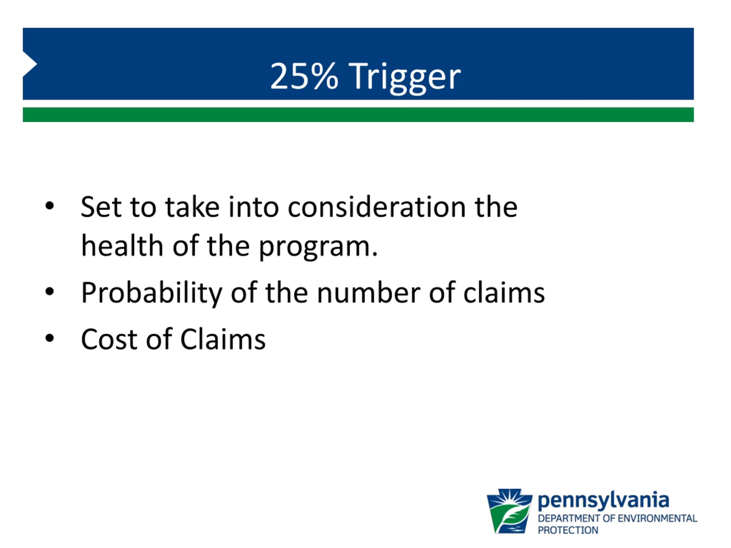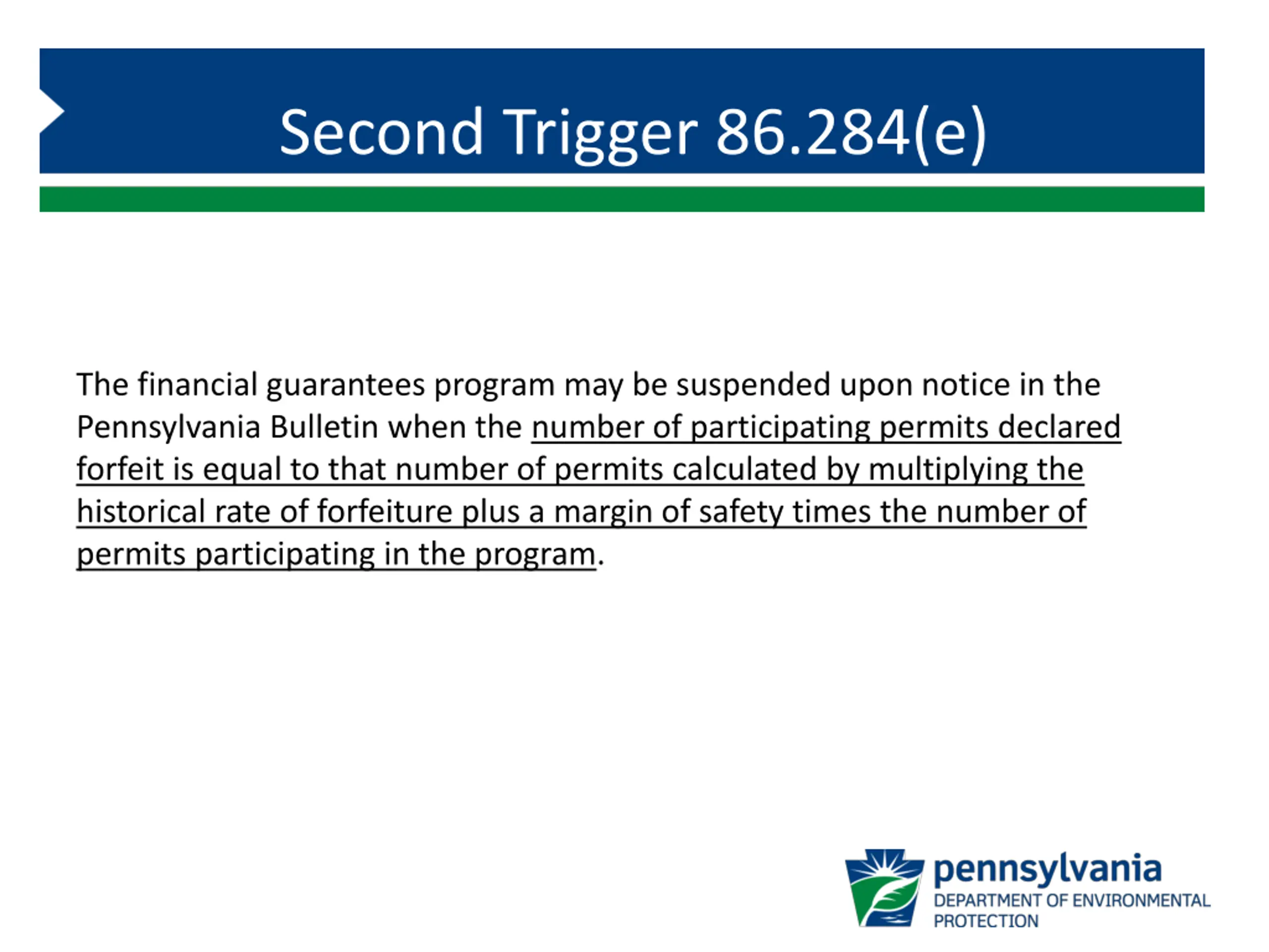 Second Trigger 86.284(e) The financial guarantees program may be suspended upon notice in the Pennsylvania Bulletin when the number of participating permits declared forfeit is equal to that number of permits calculated by multiplying the historical rate of forfeiture plus a margin of safety times the number of permits participating in the program.