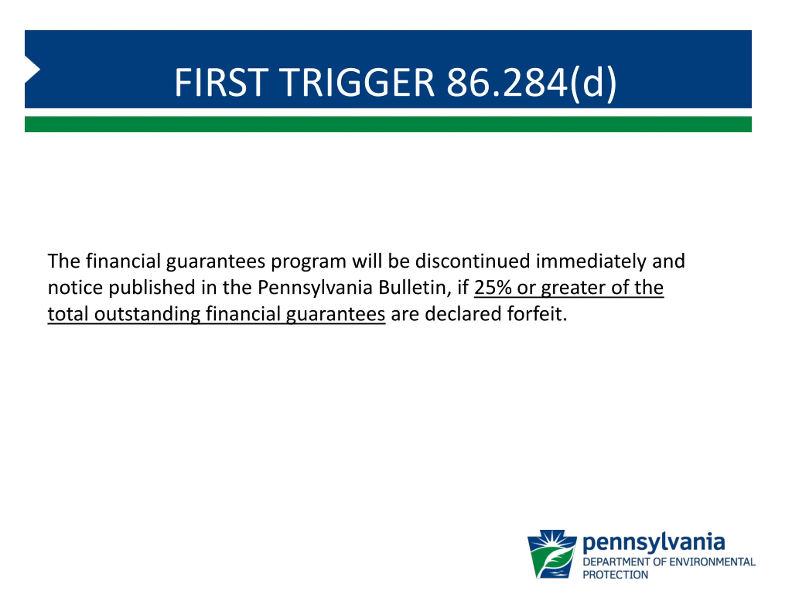 FIRST TRIGGER 86.284(d) The financial guarantees program will be discontinued immediately and notice published in the Pennsylvania Bulletin, if 25% or greater of the total outstanding financial guarantees are declared forfeit.