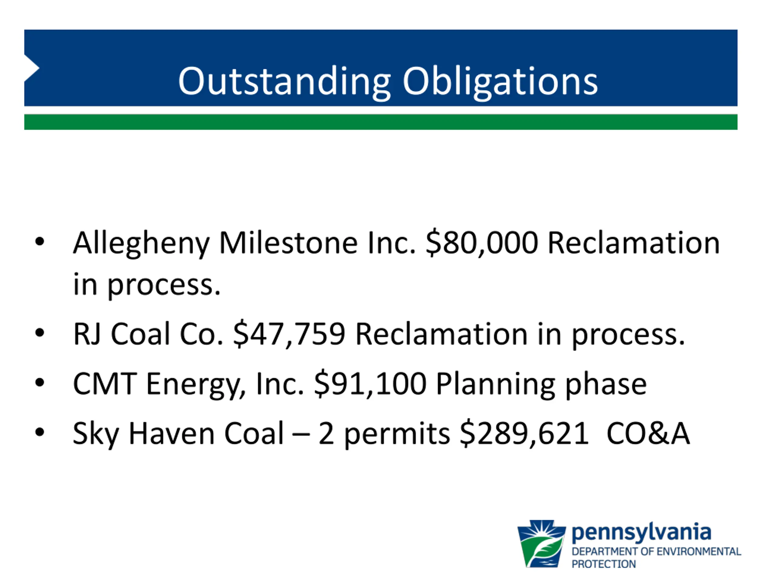 Outstanding Obligations Allegheny Milestone Inc. $80,000 Reclamation in process. RJ Coal Co. $47,759 Reclamation in process. CMT Energy, Inc. $91,100 Planning phase Sky Haven Coal 2 permits $289,621 CO&A