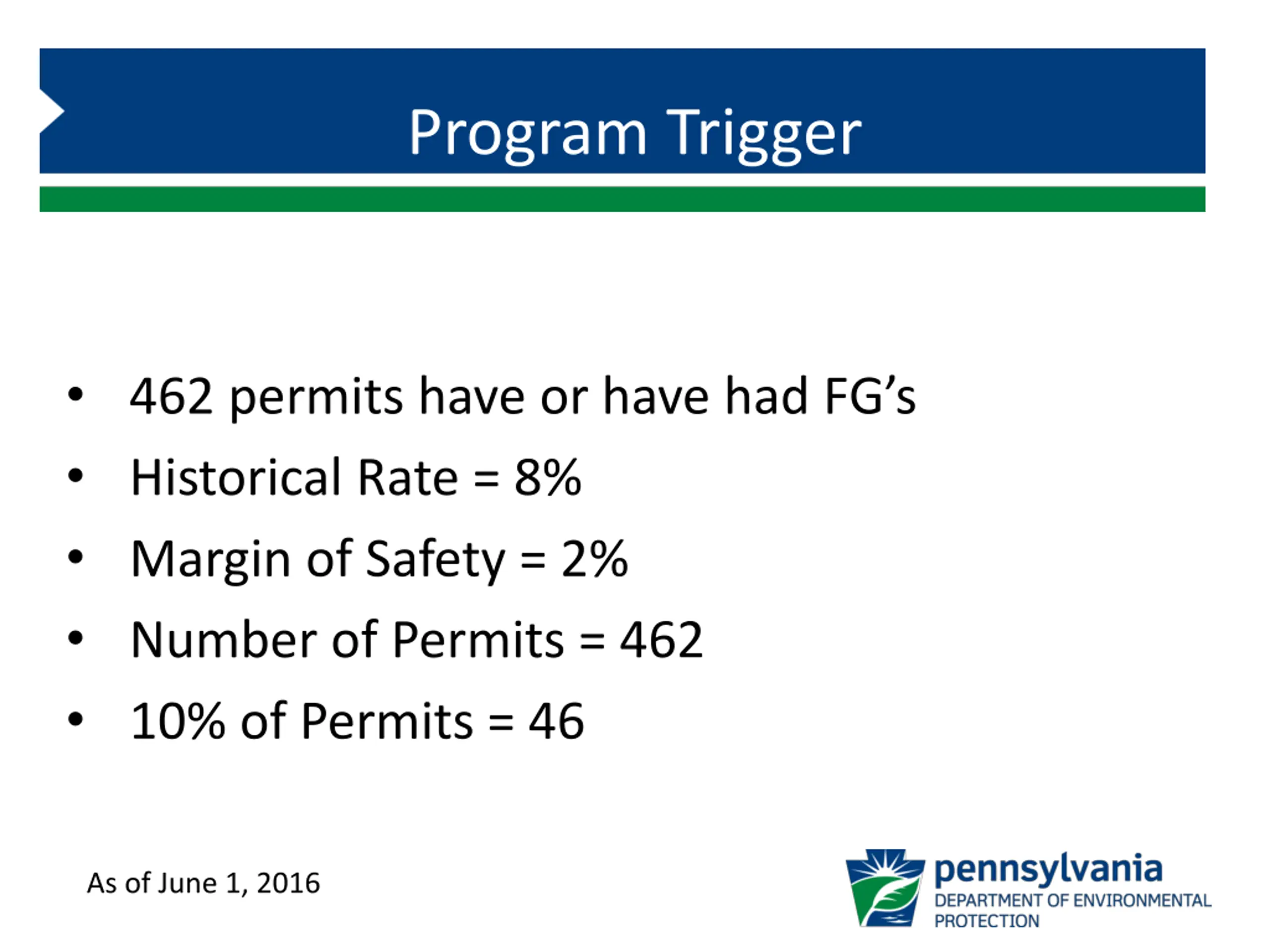 Program Trigger 462 permits have or have had FG s Historical Rate = 8% Margin of Safety = 2% Number of Permits = 462 10% of Permits = 46 As of June 1, 2016