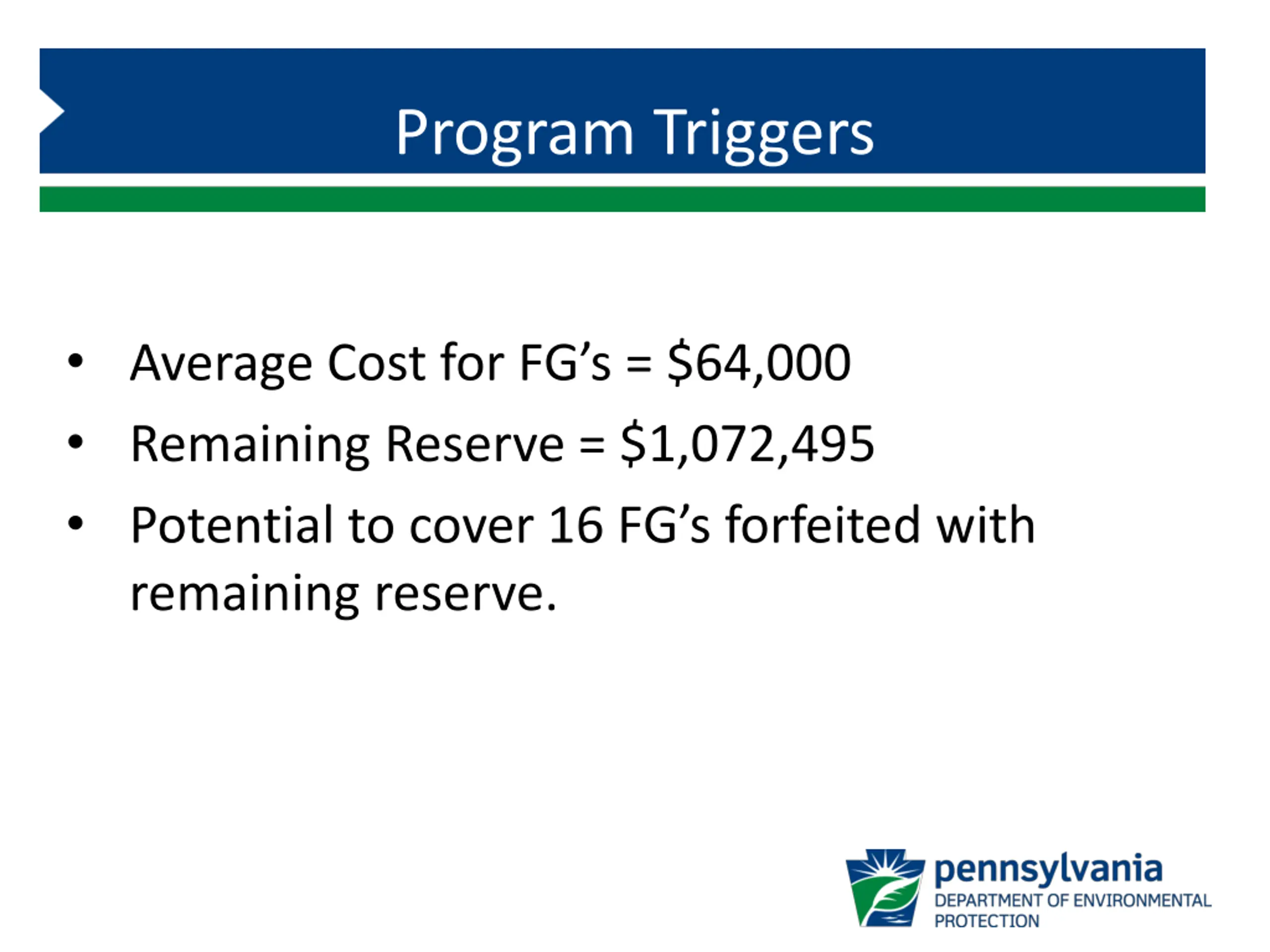 Program Triggers Average Cost for FG s = $64,000 Remaining Reserve = $1,072,495 Potential to cover 16 FG s forfeited with remaining reserve.