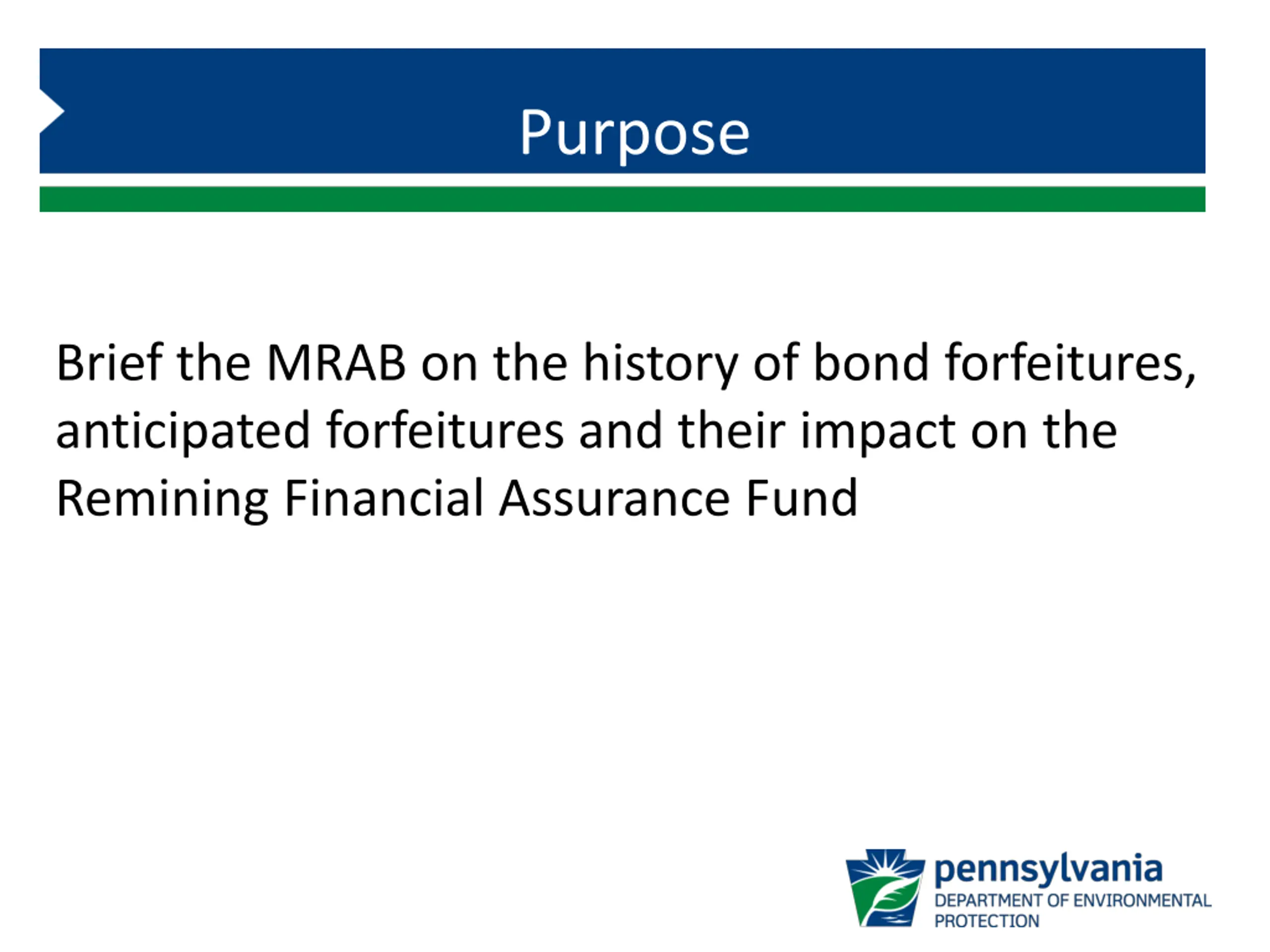 Purpose Brief the MRAB on the history of bond forfeitures, anticipated forfeitures and their impact on the Remining Financial Assurance Fund