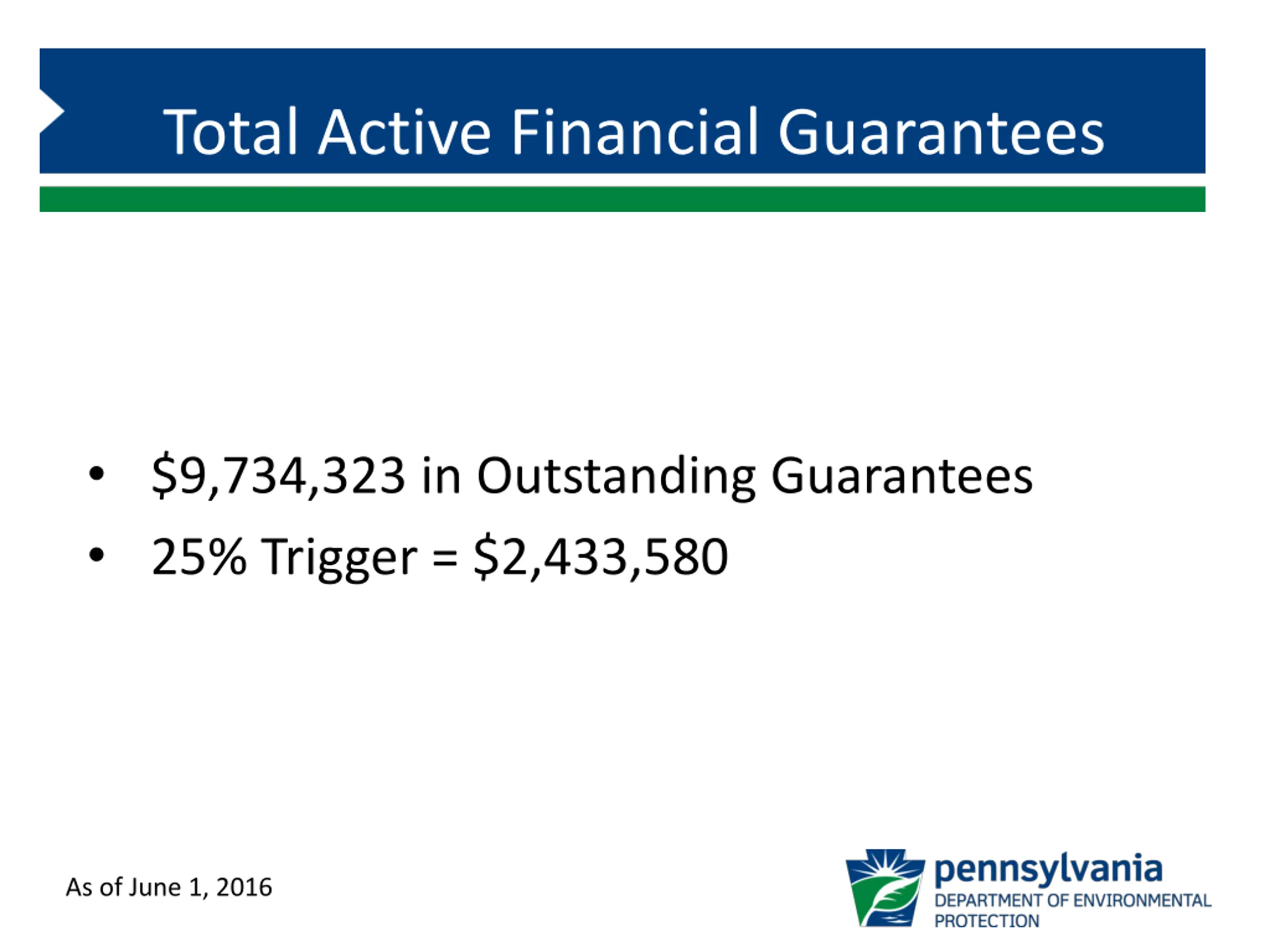 Total Active Financial Guarantees $9,734,323 in Outstanding Guarantees 25% Trigger = $2,433,580 As of June 1, 2016