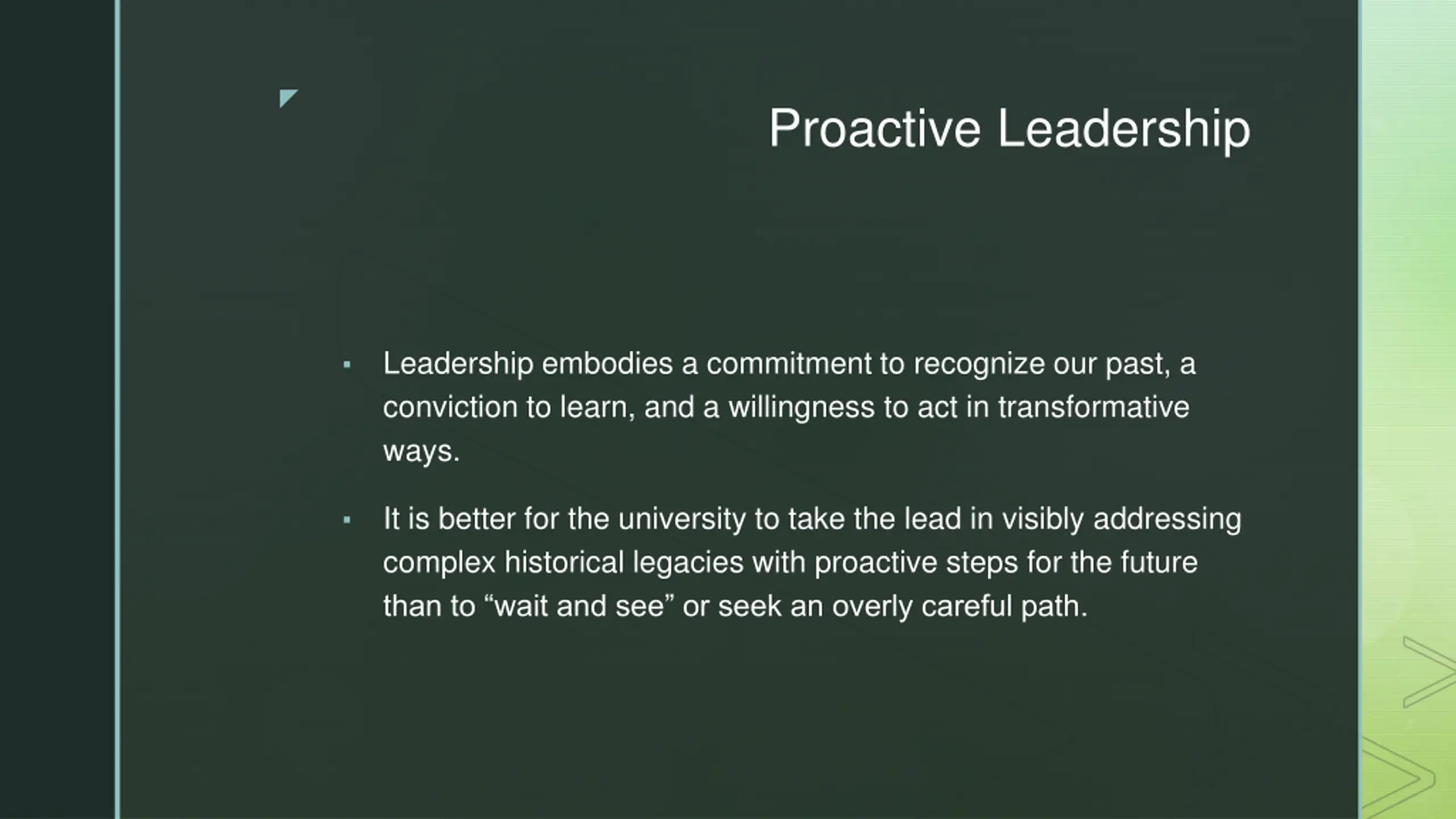 Proactive Leadership Leadership embodies a commitment to recognize our past, a conviction to learn, and a willingness to act in transformative ways. It is better for the university to take the lead in visibly addressing complex historical legacies with proactive steps for the future than to wait and see or seek an overly careful path.