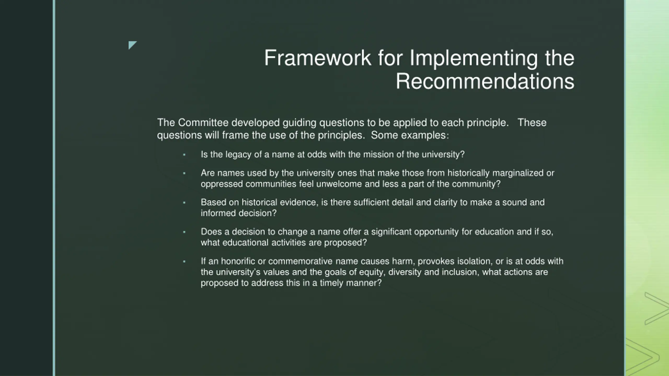 Framework for Implementing the Recommendations The Committee developed guiding questions to be applied to each principle. These questions will frame the use of the principles. Some examples: Is the legacy of a name at odds with the mission of the university? Are names used by the university ones that make those from historically marginalized or oppressed communities feel unwelcome and less a part of the community? Based on historical evidence, is there sufficient detail and clarity to make a sound and informed decision? Does a decision to change a name offer a significant opportunity for education and if so, what educational activities are proposed? If an honorific or commemorative name causes harm, provokes isolation, or is at odds with the university s values and the goals of equity, diversity and inclusion, what actions are proposed to address this in a timely manner?