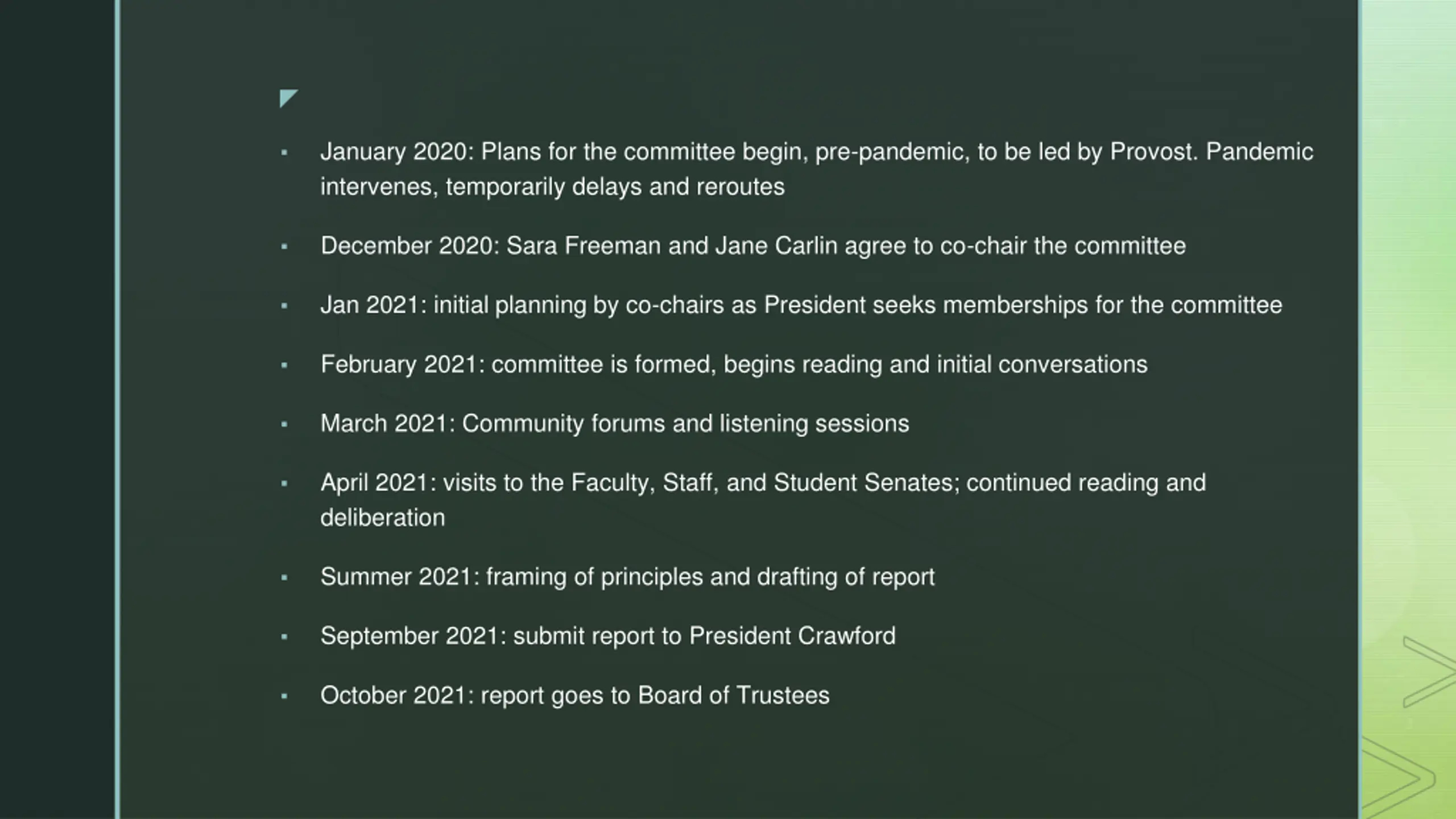 January 2020: Plans for the committee begin, pre-pandemic, to be led by Provost. Pandemic intervenes, temporarily delays and reroutes December 2020: Sara Freeman and Jane Carlin agree to co-chair the committee Jan 2021: initial planning by co-chairs as President seeks memberships for the committee February 2021: committee is formed, begins reading and initial conversations March 2021: Community forums and listening sessions April 2021: visits to the Faculty, Staff, and Student Senates; continued reading and deliberation Summer 2021: framing of principles and drafting of report September 2021: submit report to President Crawford October 2021: report goes to Board of Trustees