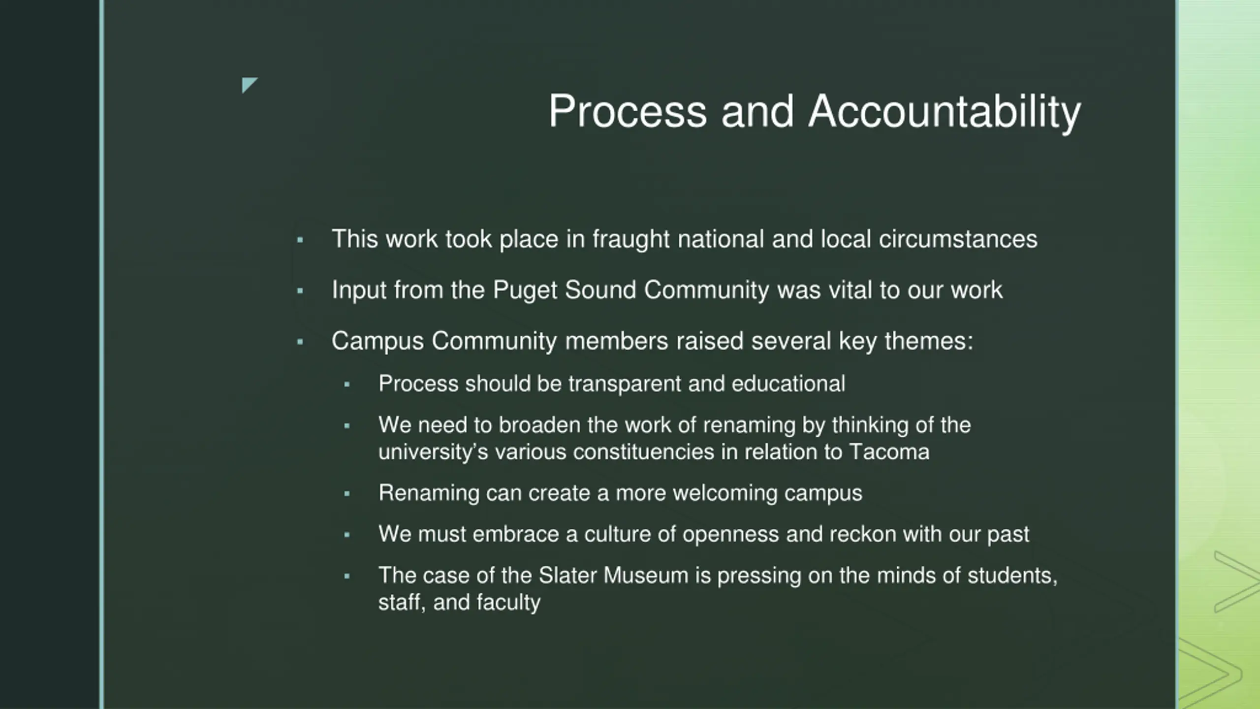 Process and Accountability This work took place in fraught national and local circumstances Input from the Puget Sound Community was vital to our work Campus Community members raised several key themes: Process should be transparent and educational We need to broaden the work of renaming by thinking of the university s various constituencies in relation to Tacoma Renaming can create a more welcoming campus We must embrace a culture of openness and reckon with our past The case of the Slater Museum is pressing on the minds of students, staff, and faculty