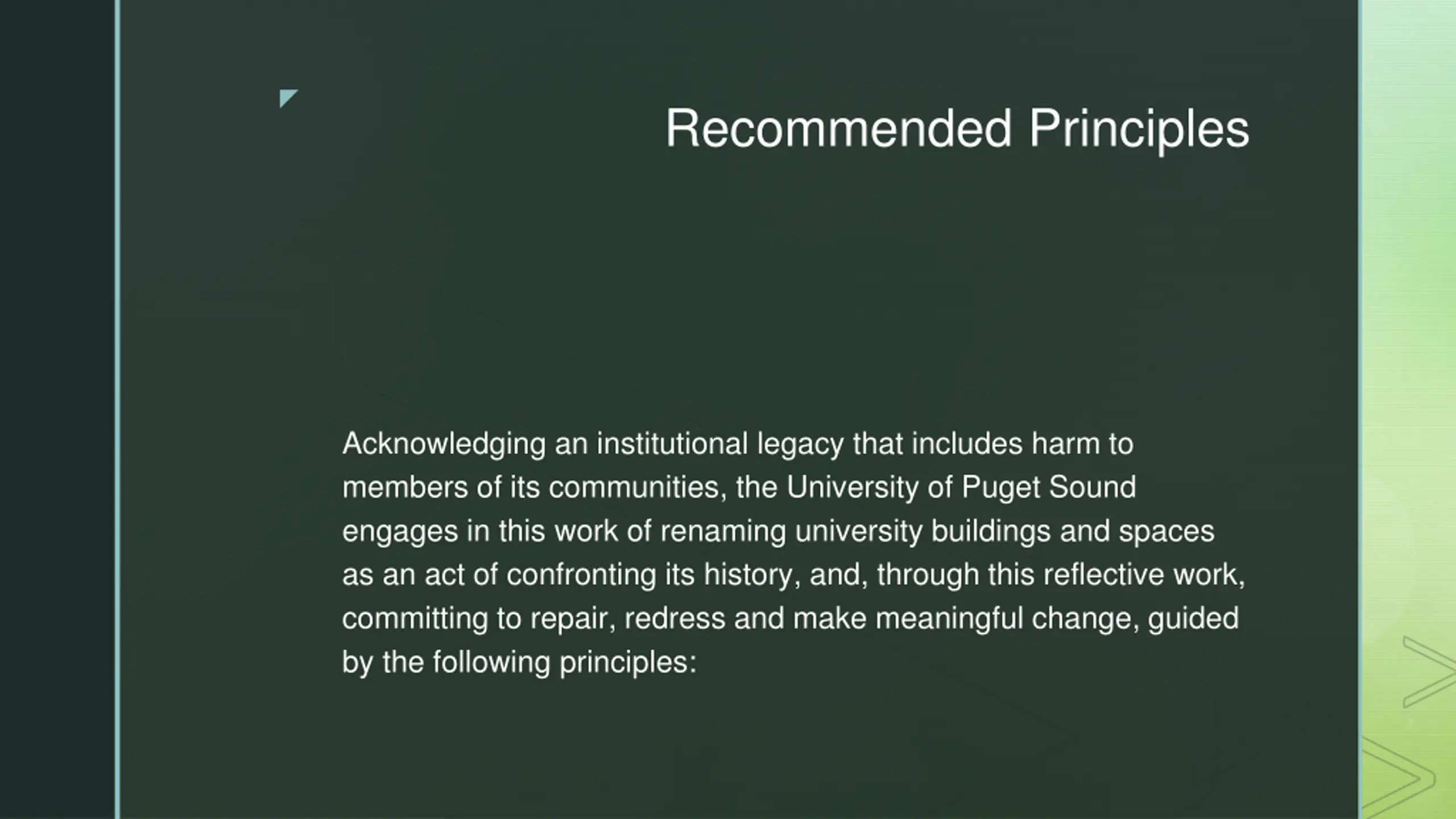 Recommended Principles Acknowledging an institutional legacy that includes harm to members of its communities, the University of Puget Sound engages in this work of renaming university buildings and spaces as an act of confronting its history, and, through this reflective work, committing to repair, redress and make meaningful change, guided by the following principles: