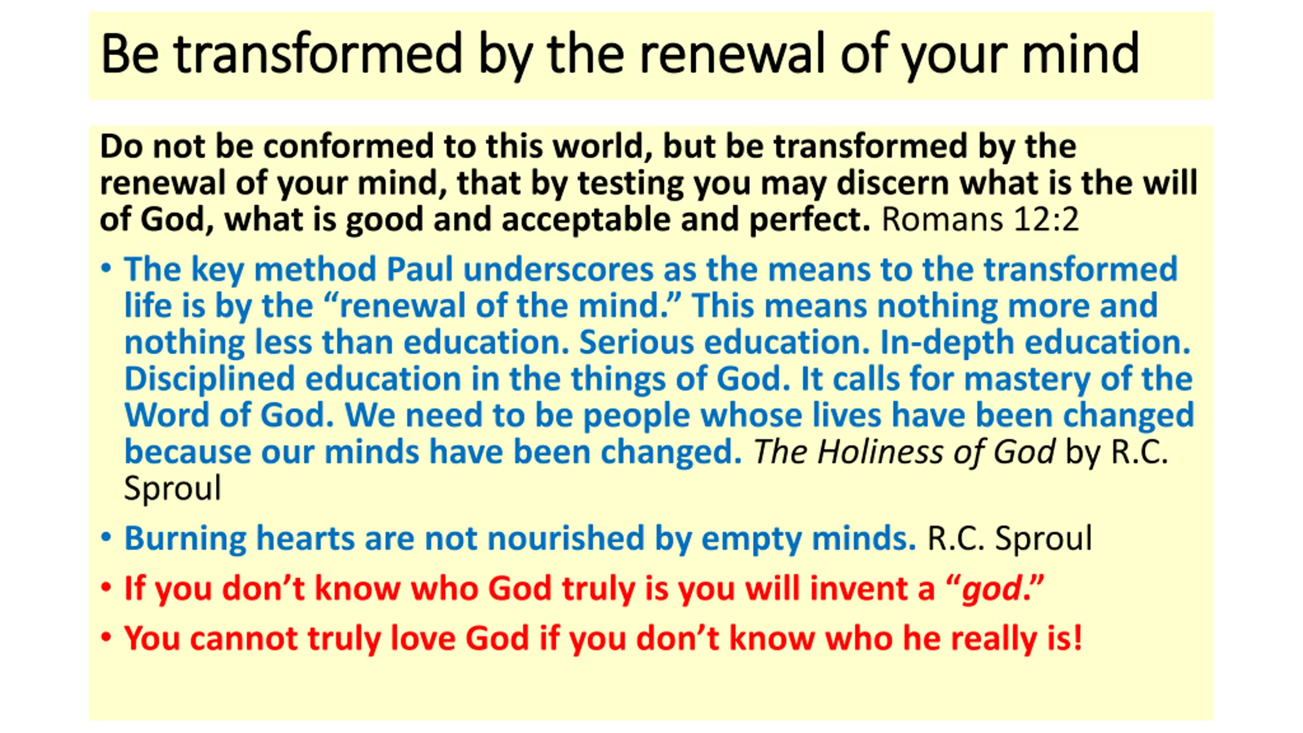 Be transformed by the renewal of your mind Be transformed by the renewal of your mind Do not be conformed to this world, but be transformed by the renewal of your mind, that by testing you may discern what is the will of God, what is good and acceptable and perfect. Romans 12:2 The key method Paul underscores as the means to the transformed life is by the renewal of the mind. This means nothing more and nothing less than education. Serious education. In-depth education. Disciplined education in the things of God. It calls for mastery of the Word of God. We need to be people whose lives have been changed because our minds have been changed. The Holiness of God by R.C. Sproul Burning hearts are not nourished by empty minds. R.C. Sproul If you don t know who God truly is you will invent a god. You cannot truly love God if you don t know who he really is!