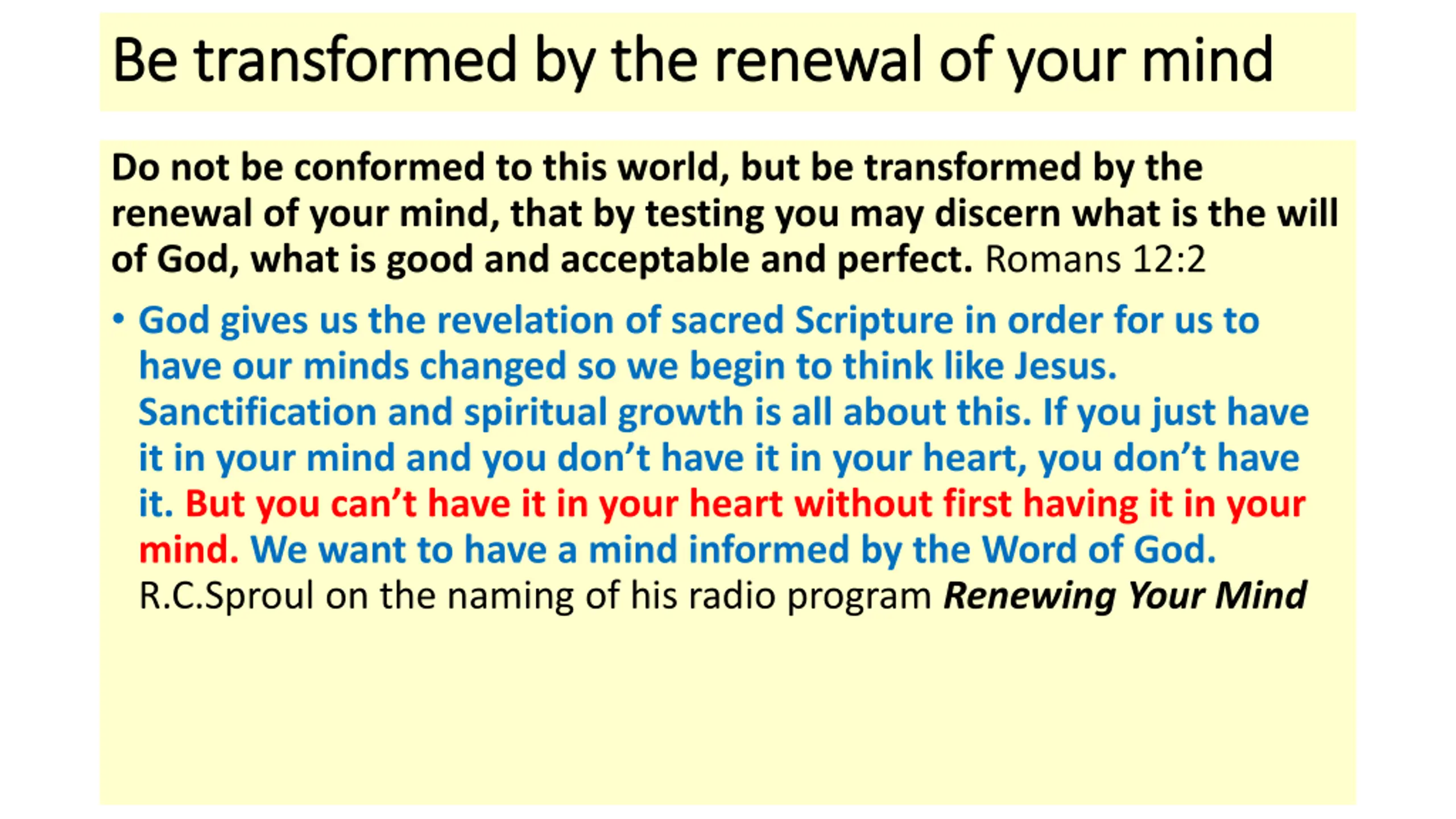 Be transformed by the renewal of your mind Be transformed by the renewal of your mind Do not be conformed to this world, but be transformed by the renewal of your mind, that by testing you may discern what is the will of God, what is good and acceptable and perfect. Romans 12:2 God gives us the revelation of sacred Scripture in order for us to have our minds changed so we begin to think like Jesus. Sanctification and spiritual growth is all about this. If you just have it in your mind and you don t have it in your heart, you don t have it. But you can t have it in your heart without first having it in your mind. We want to have a mind informed by the Word of God. R.C.Sproul on the naming of his radio program Renewing Your Mind