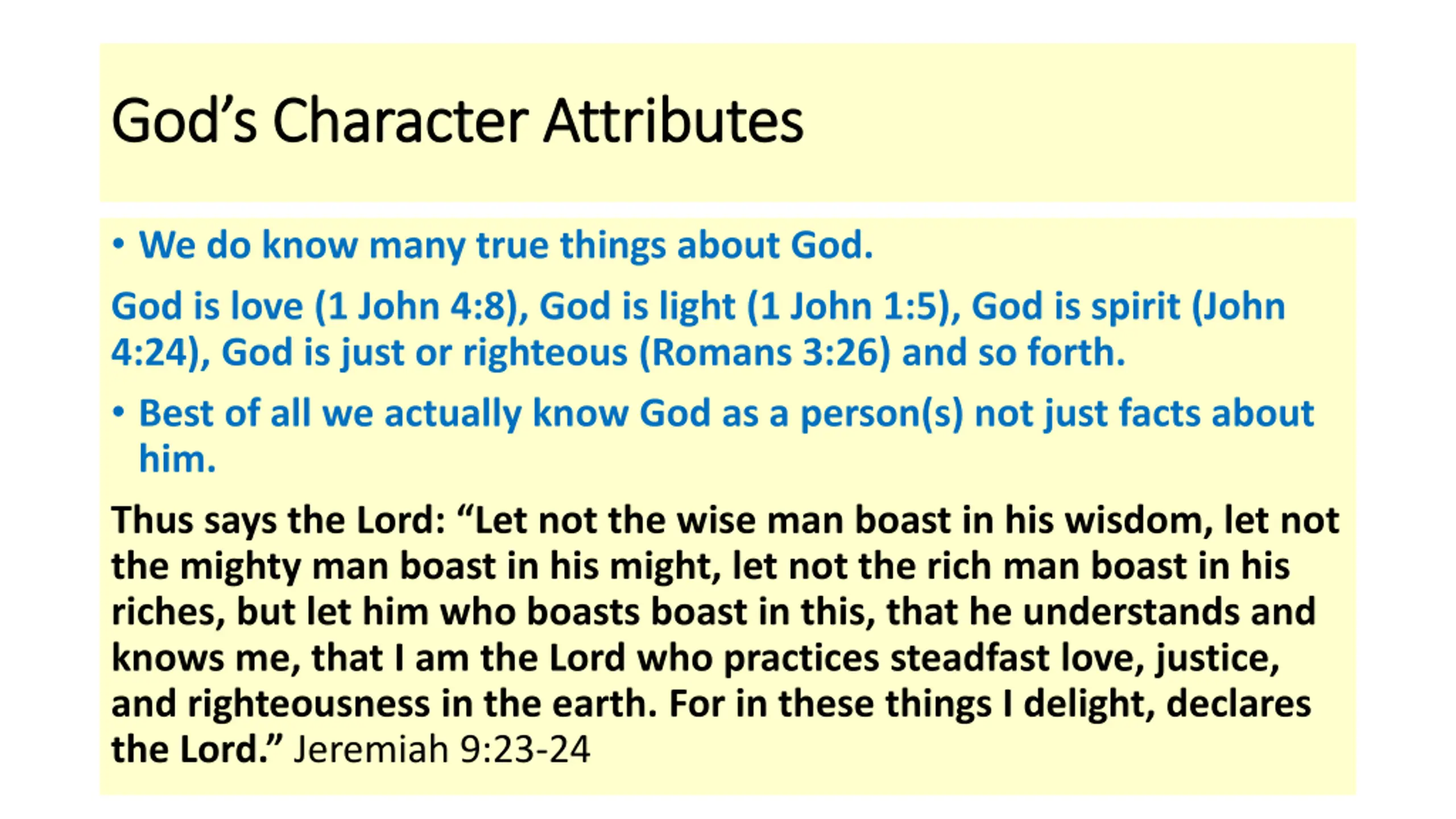 Gods Character Attributes God s Character Attributes We do know many true things about God. God is love (1 John 4:8), God is light (1 John 1:5), God is spirit (John 4:24), God is just or righteous (Romans 3:26) and so forth. Best of all we actually know God as a person(s) not just facts about him. Thus says the Lord: Let not the wise man boast in his wisdom, let not the mighty man boast in his might, let not the rich man boast in his riches, but let him who boasts boast in this, that he understands and knows me, that I am the Lord who practices steadfast love, justice, and righteousness in the earth. For in these things I delight, declares the Lord. Jeremiah 9:23-24