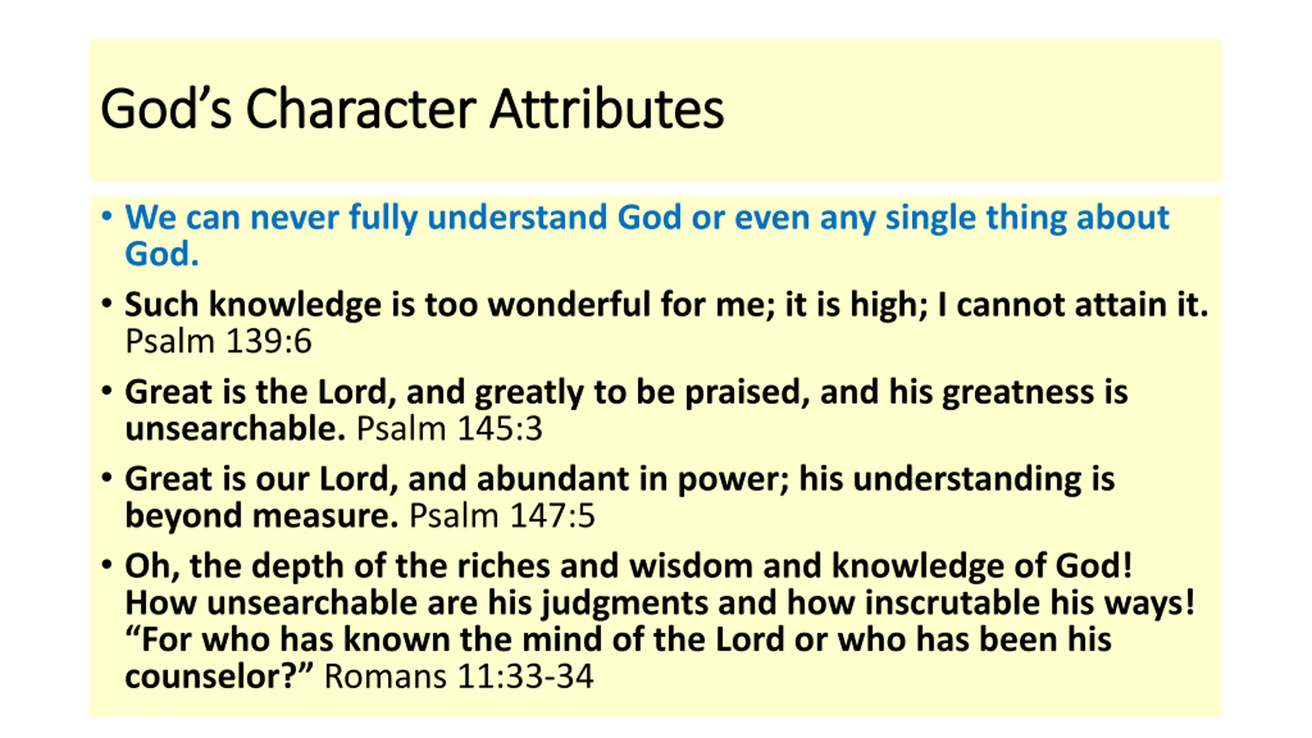 Gods Character Attributes God s Character Attributes We can never fully understand God or even any single thing about God. Such knowledge is too wonderful for me; it is high; I cannot attain it. Psalm 139:6 Great is the Lord, and greatly to be praised, and his greatness is unsearchable. Psalm 145:3 Great is our Lord, and abundant in power; his understanding is beyond measure. Psalm 147:5 Oh, the depth of the riches and wisdom and knowledge of God! How unsearchable are his judgments and how inscrutable his ways! For who has known the mind of the Lord or who has been his counselor? Romans 11:33-34