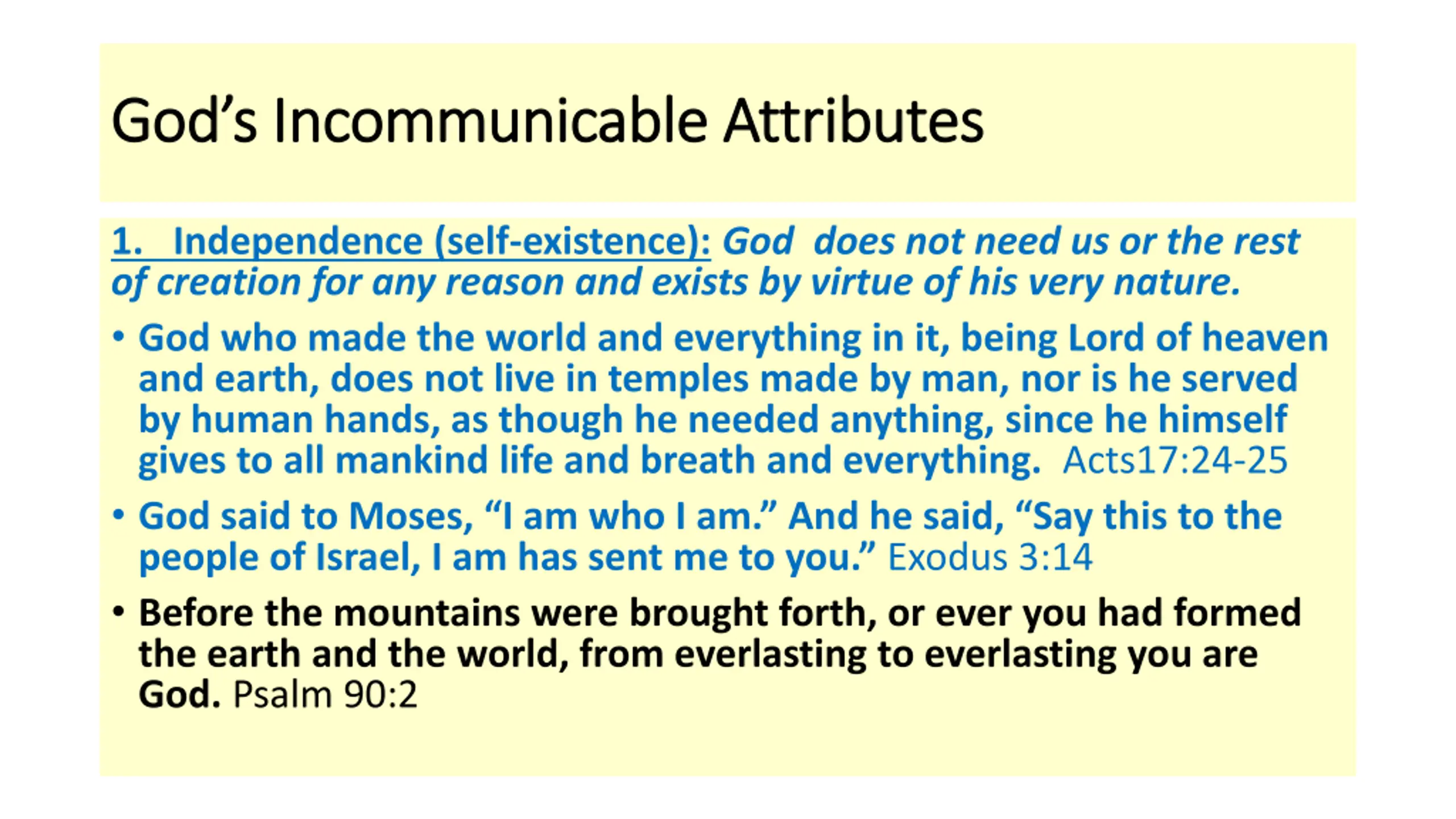 Gods Incommunicable Attributes God s Incommunicable Attributes 1. Independence (self-existence): God does not need us or the rest of creation for any reason and exists by virtue of his very nature. God who made the world and everything in it, being Lord of heaven and earth, does not live in temples made by man, nor is he served by human hands, as though he needed anything, since he himself gives to all mankind life and breath and everything. Acts17:24-25 God said to Moses, I am who I am. And he said, Say this to the people of Israel, I am has sent me to you. Exodus 3:14 Before the mountains were brought forth, or ever you had formed the earth and the world, from everlasting to everlasting you are God. Psalm 90:2