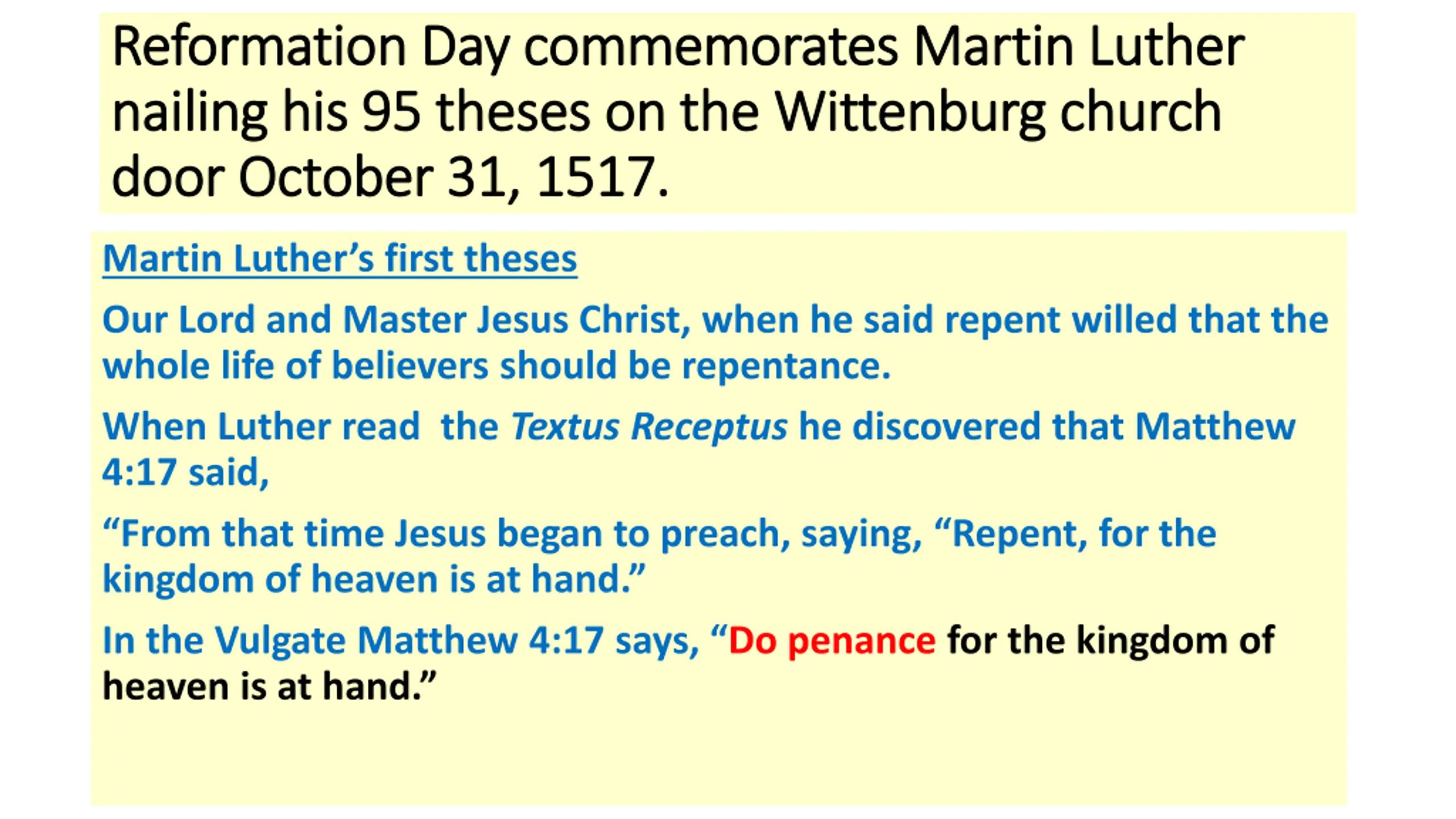 Reformation Day commemorates Martin Luther Reformation Day commemorates Martin Luther nailing his 95 theses on the nailing his 95 theses on the Wittenburg door October 31, 1517. door October 31, 1517. Wittenburg church church Martin Luther s first theses Our Lord and Master Jesus Christ, when he said repent willed that the whole life of believers should be repentance. When Luther read the Textus Receptus he discovered that Matthew 4:17 said, From that time Jesus began to preach, saying, Repent, for the kingdom of heaven is at hand. In the Vulgate Matthew 4:17 says, Do penance for the kingdom of heaven is at hand.