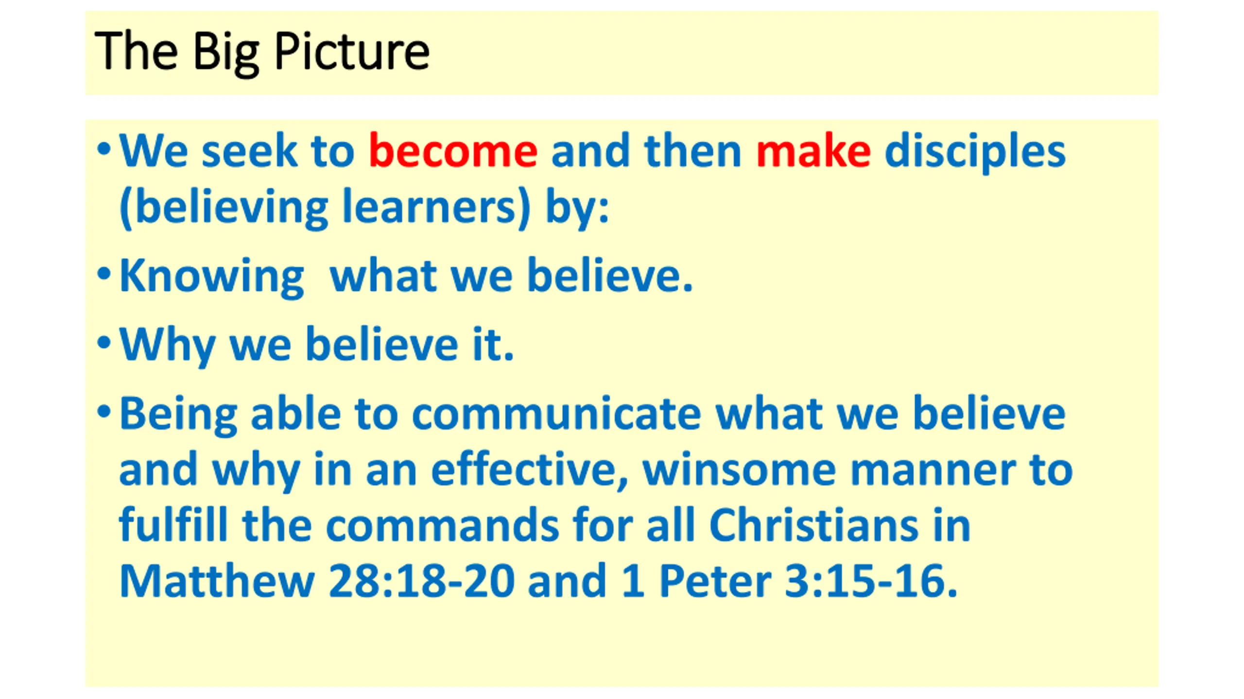 The Big Picture The Big Picture We seek to become and then make disciples (believing learners) by: Knowing what we believe. Why we believe it. Being able to communicate what we believe and why in an effective, winsome manner to fulfill the commands for all Christians in Matthew 28:18-20 and 1 Peter 3:15-16.