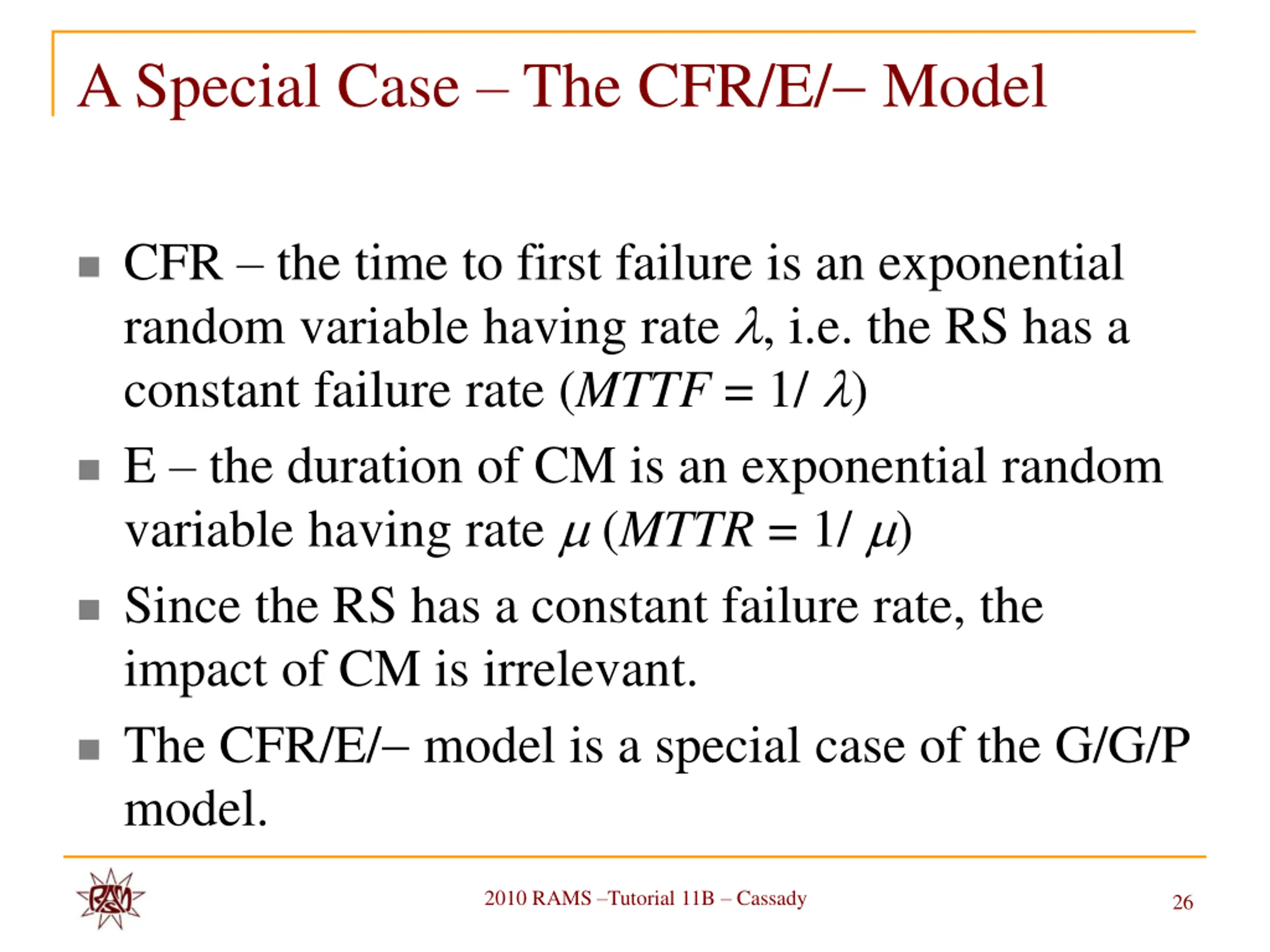 A Special Case The CFR/E/ Model CFR the time to first failure is an exponential random variable having rate , i.e. the RS has a constant failure rate (MTTF = 1/ ) E the duration of CM is an exponential random variable having rate (MTTR = 1/ ) Since the RS has a constant failure rate, the impact of CM is irrelevant. The CFR/E/ model is a special case of the G/G/P model. 2010 RAMS Tutorial 11B Cassady 26
