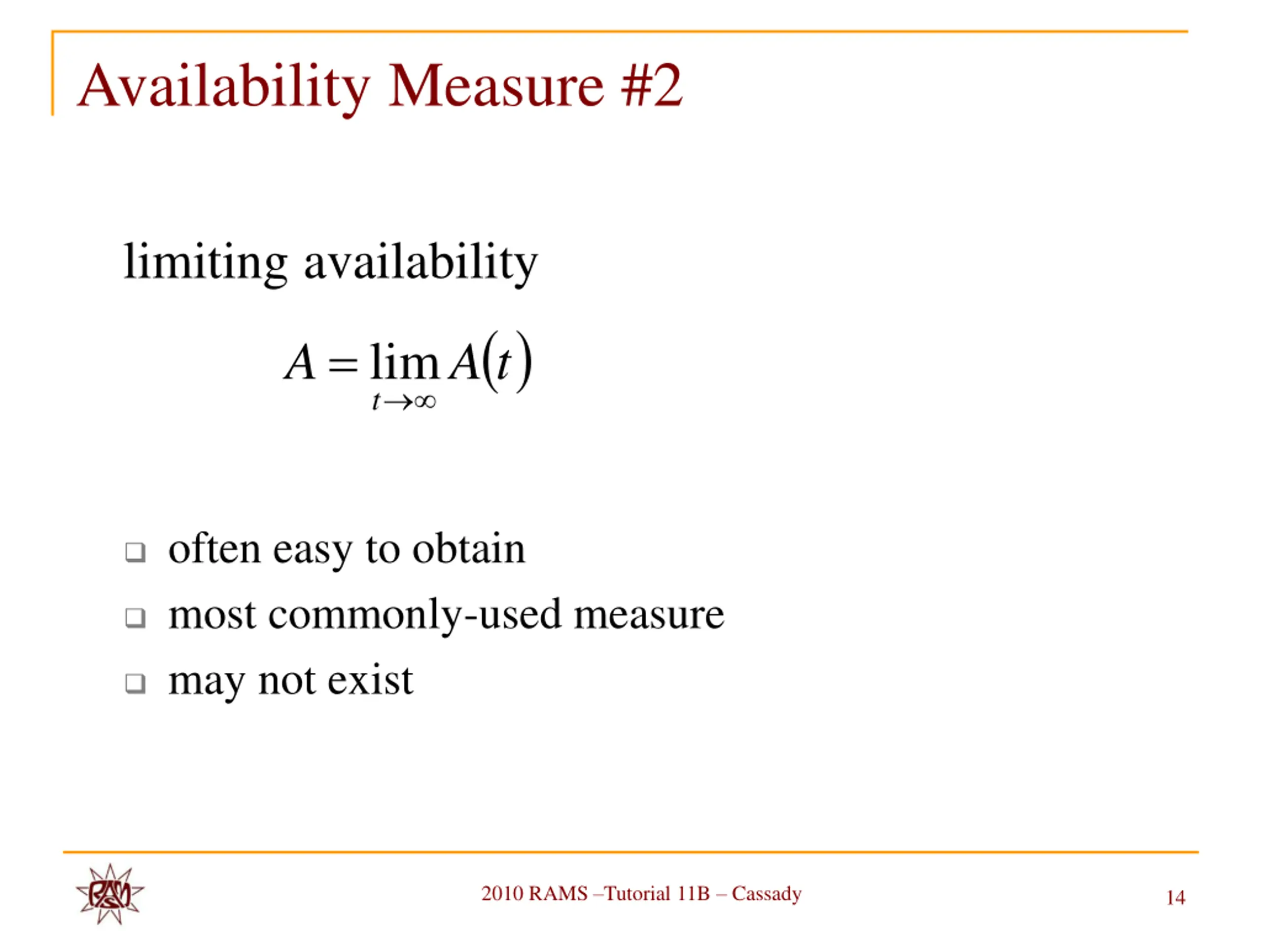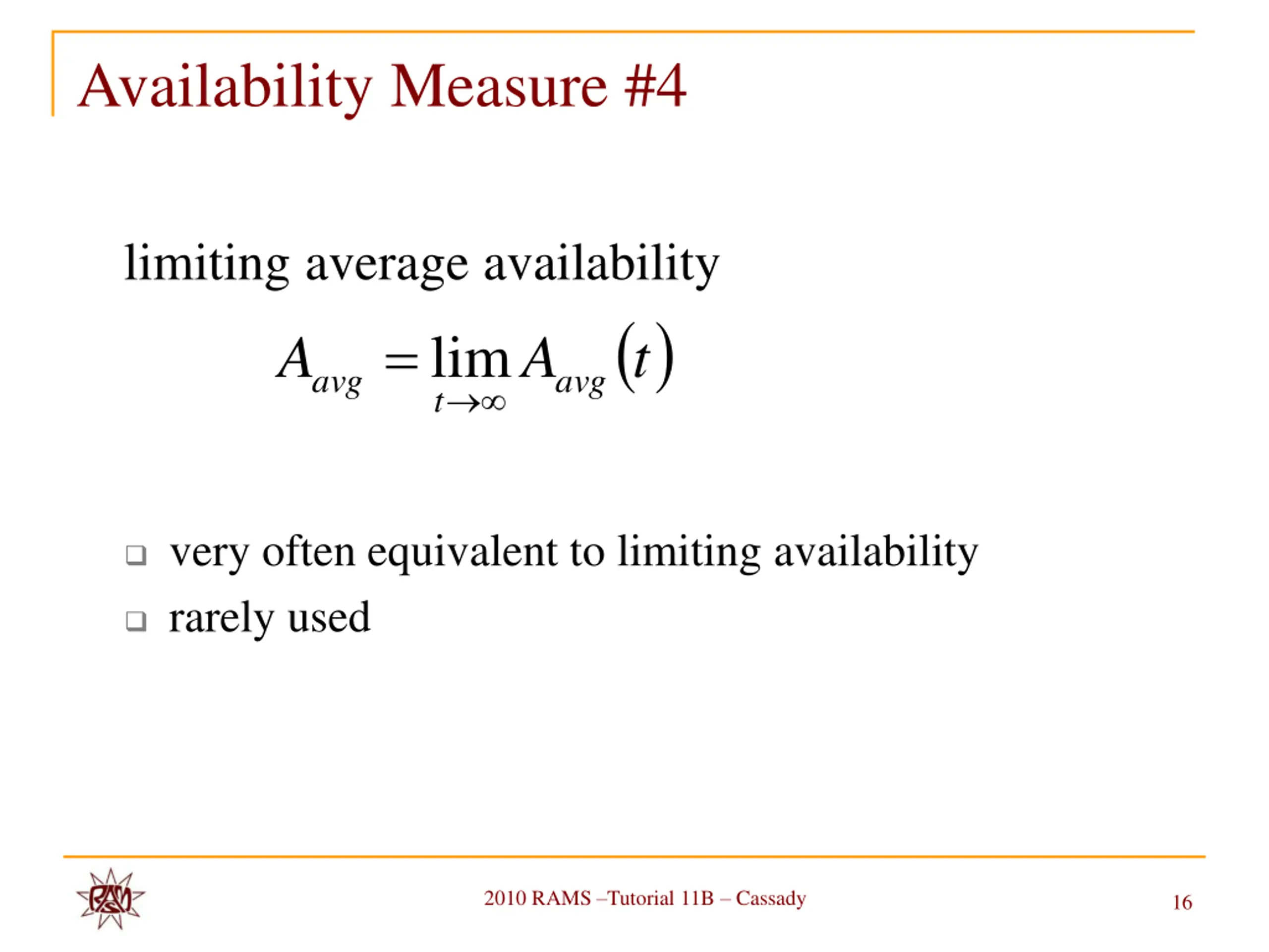 Availability Measure #4 limiting average availability =lim ( ) t A A avg avg t very often equivalent to limiting availability rarely used 2010 RAMS Tutorial 11B Cassady 16