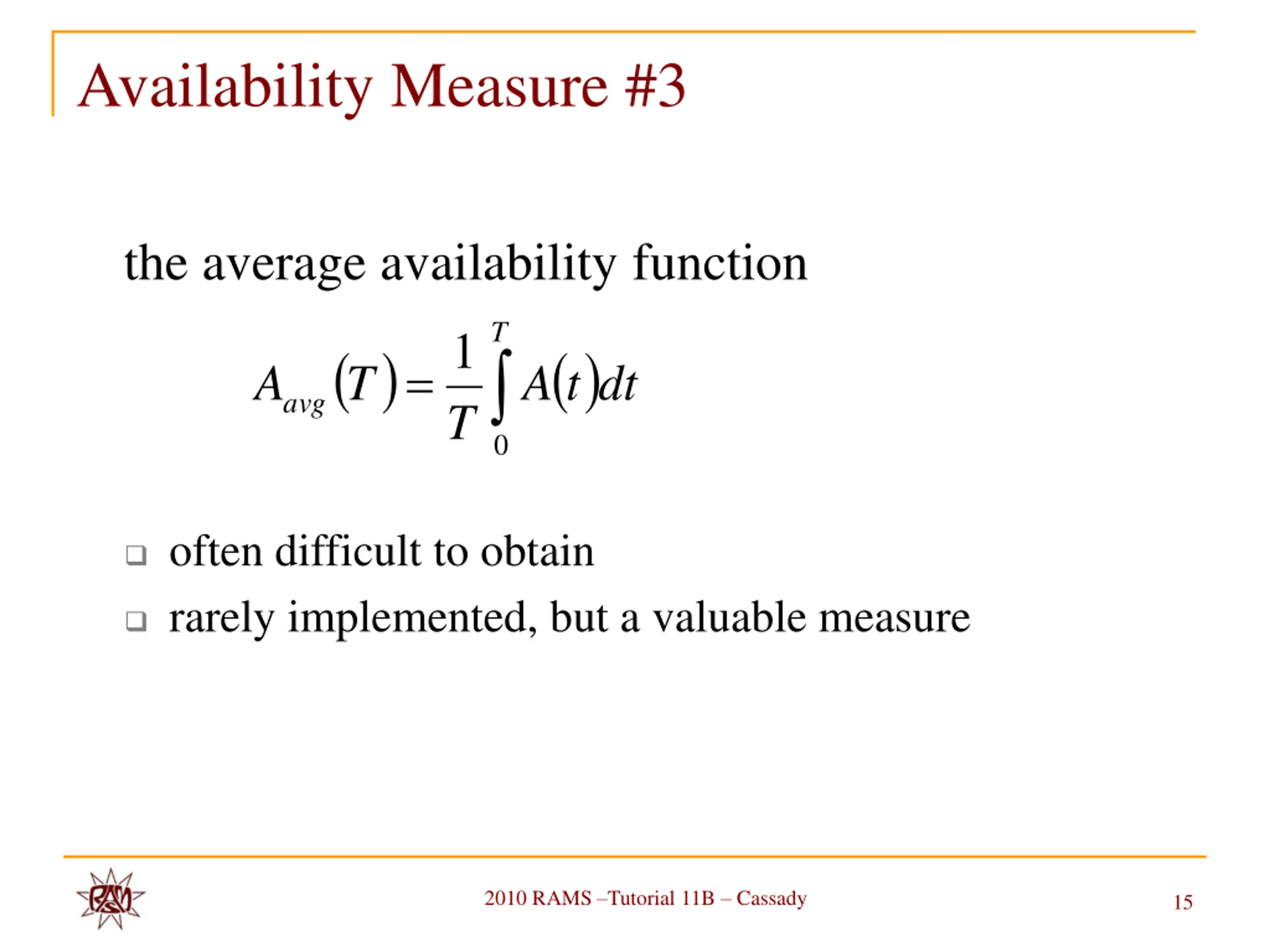 Availability Measure #3 the average availability function T 1 ( ) T ( ) t 0 = A A dt avg T often difficult to obtain rarely implemented, but a valuable measure 2010 RAMS Tutorial 11B Cassady 15