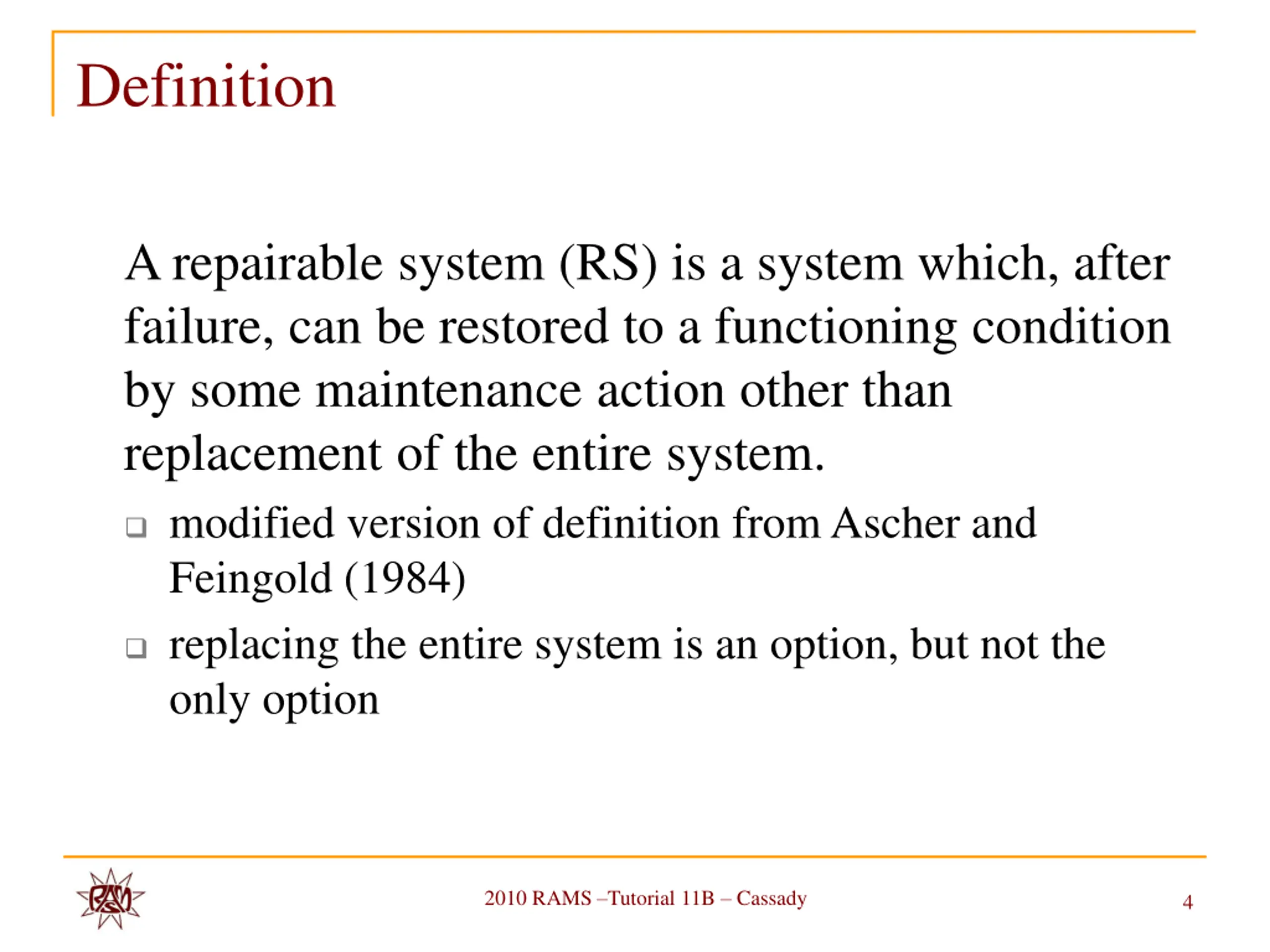 What is a repairable system? definition of a repairable system types of maintenance actions definition of repairable systems modeling repairable system performance measures a repairable systems taxonomy 2010 RAMS Tutorial 11B Cassady 3