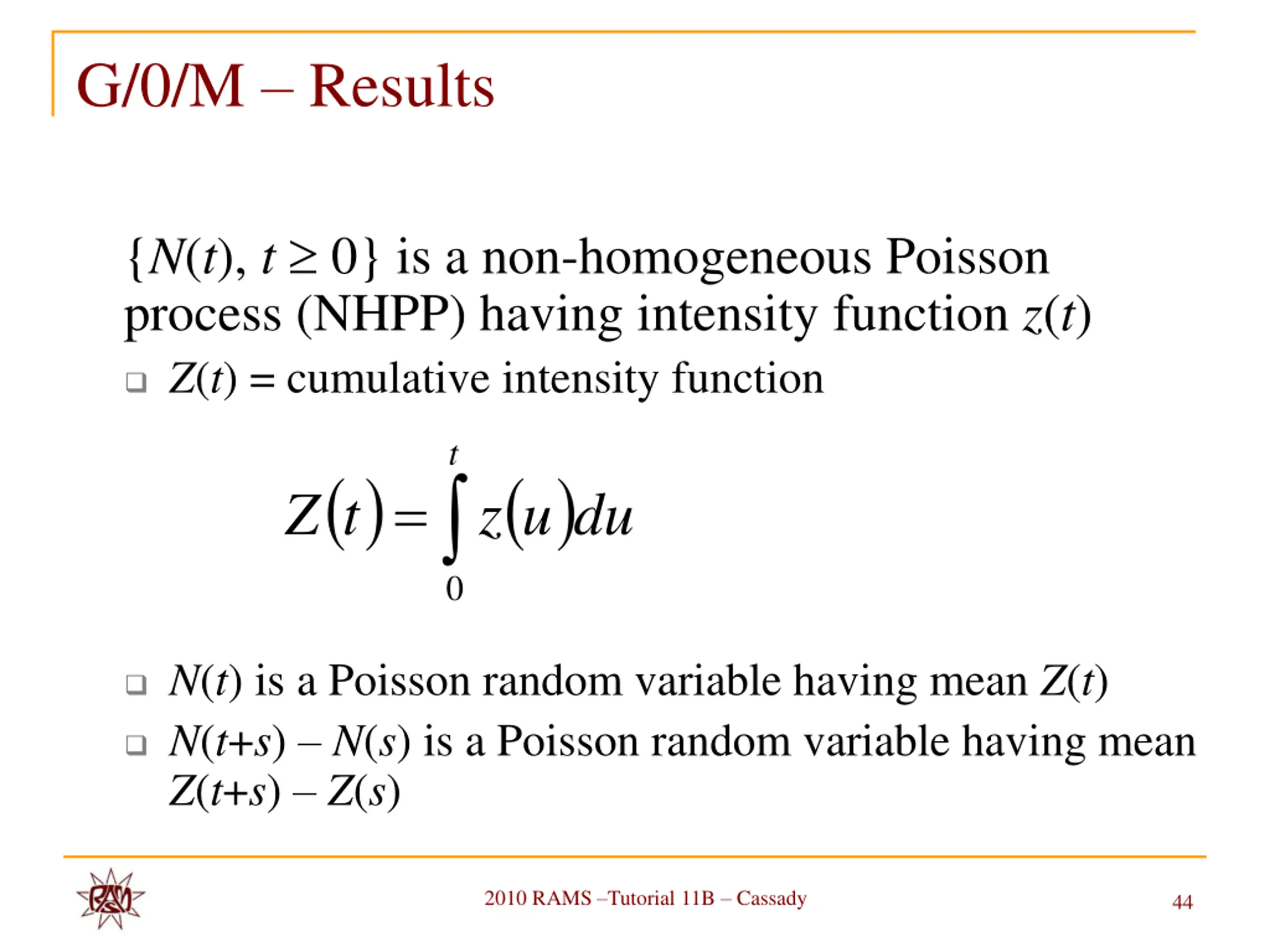 G/0/M Results {N(t), t 0} is a non-homogeneous Poisson process (NHPP) having intensity function z(t) Z(t) = cumulative intensity function t ( ) t ( ) u 0 = Z z du N(t) is a Poisson random variable having mean Z(t) N(t+s) N(s) is a Poisson random variable having mean Z(t+s) Z(s) 2010 RAMS Tutorial 11B Cassady 44