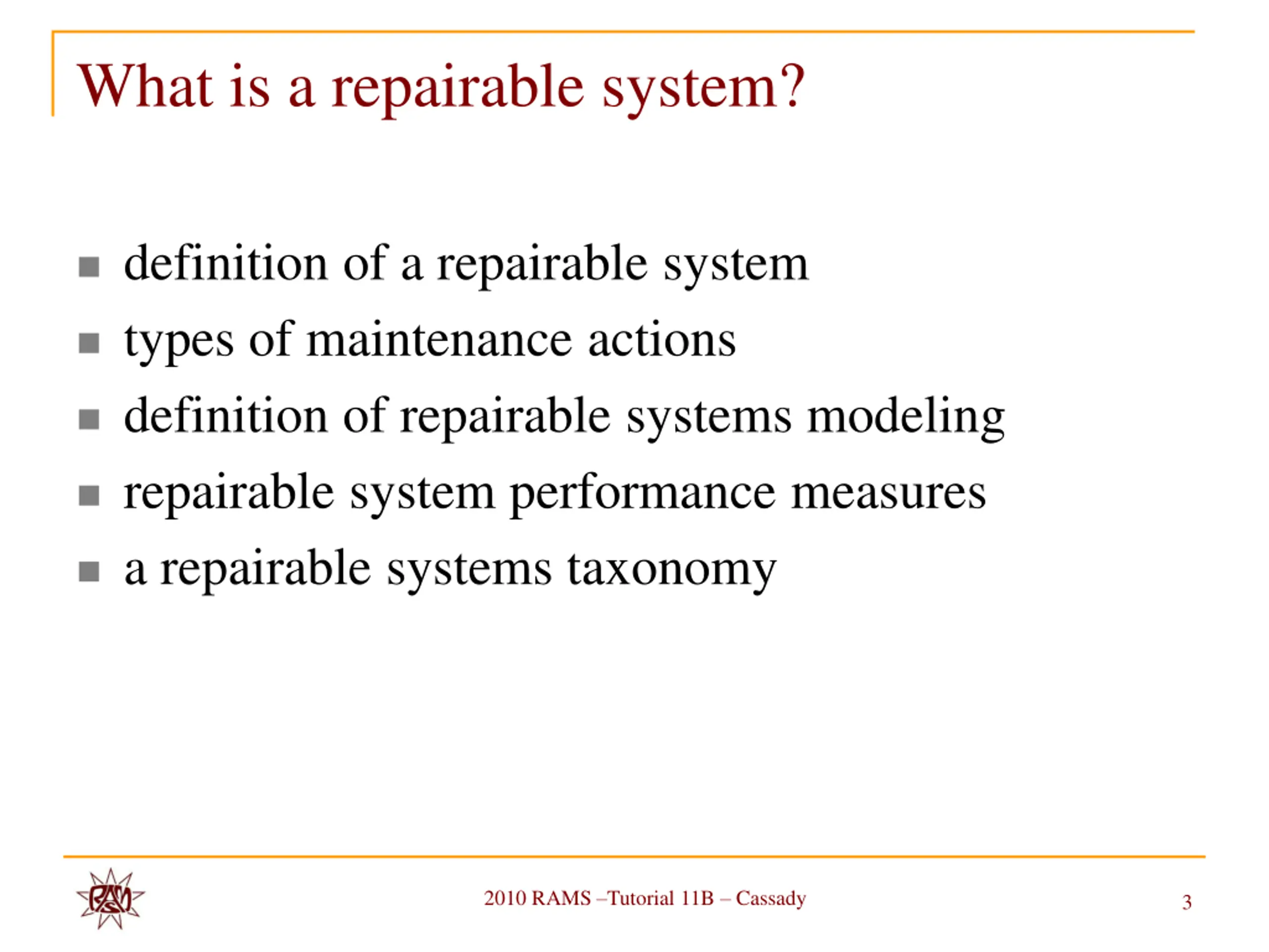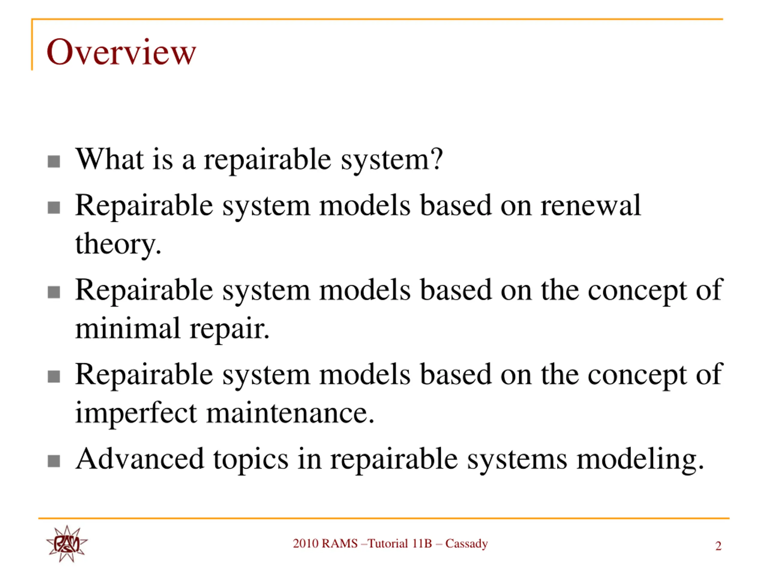 Overview What is a repairable system? Repairable system models based on renewal theory. Repairable system models based on the concept of minimal repair. Repairable system models based on the concept of imperfect maintenance. Advanced topics in repairable systems modeling. 2010 RAMS Tutorial 11B Cassady 2