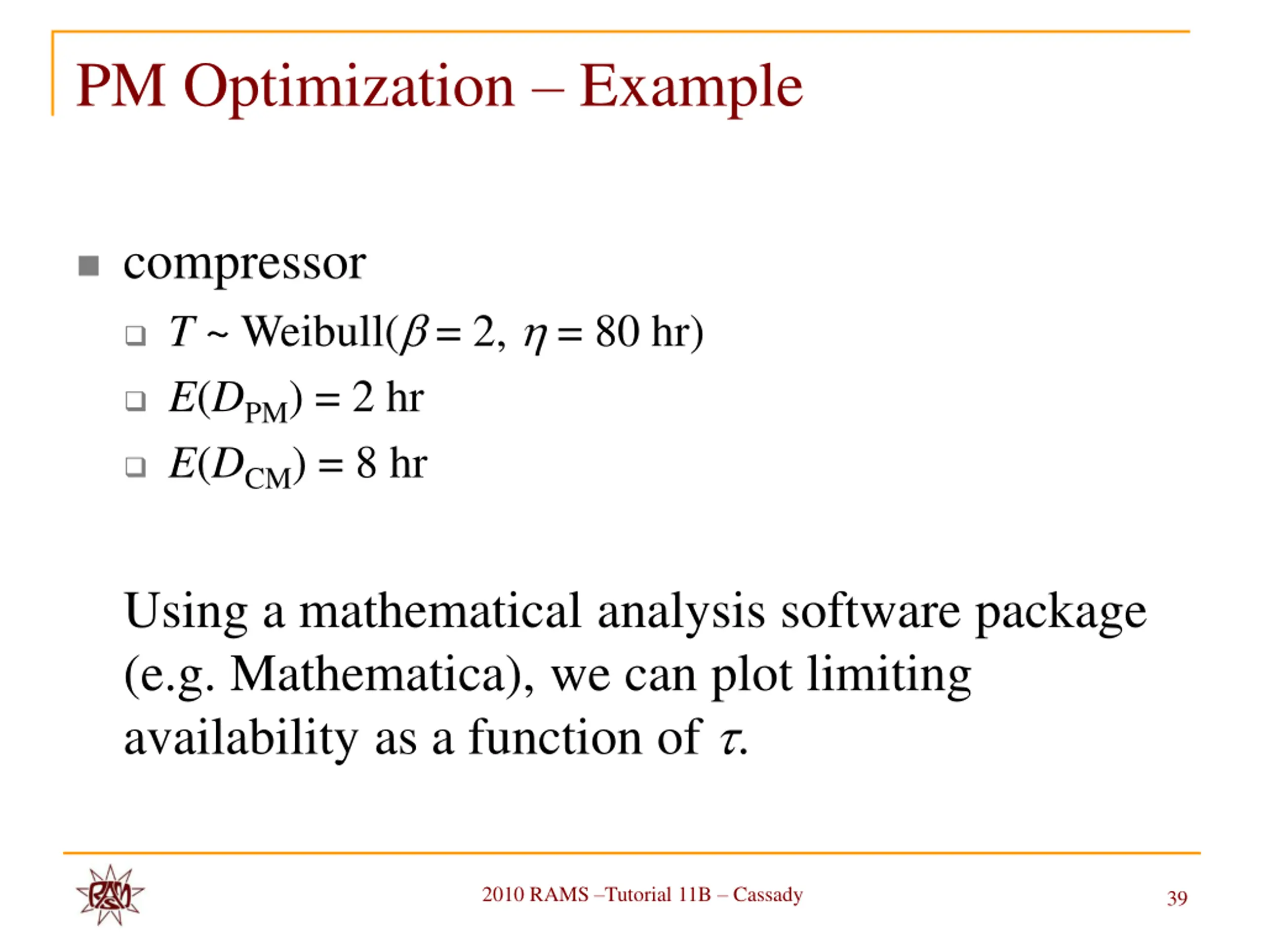 PM Optimization Example compressor T ~ Weibull( = 2, = 80 hr) E(DPM) = 2 hr E(DCM) = 8 hr Using a mathematical analysis software package (e.g. Mathematica), we can plot limiting availability as a function of . 2010 RAMS Tutorial 11B Cassady 39