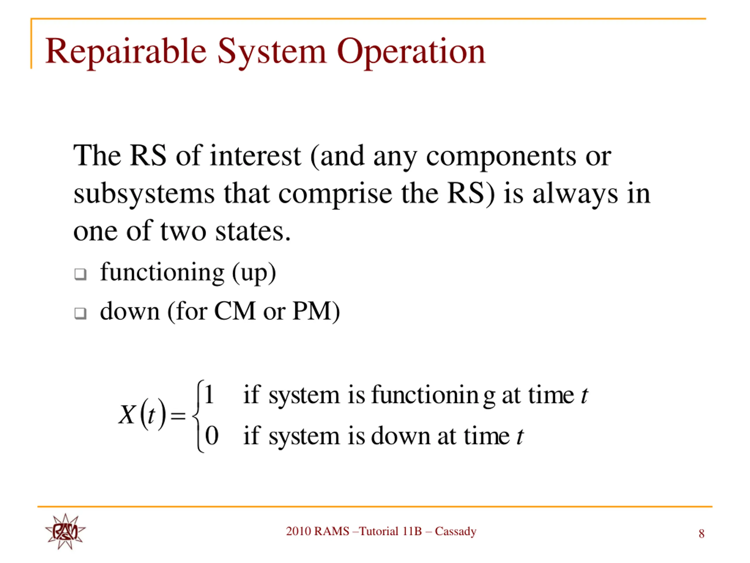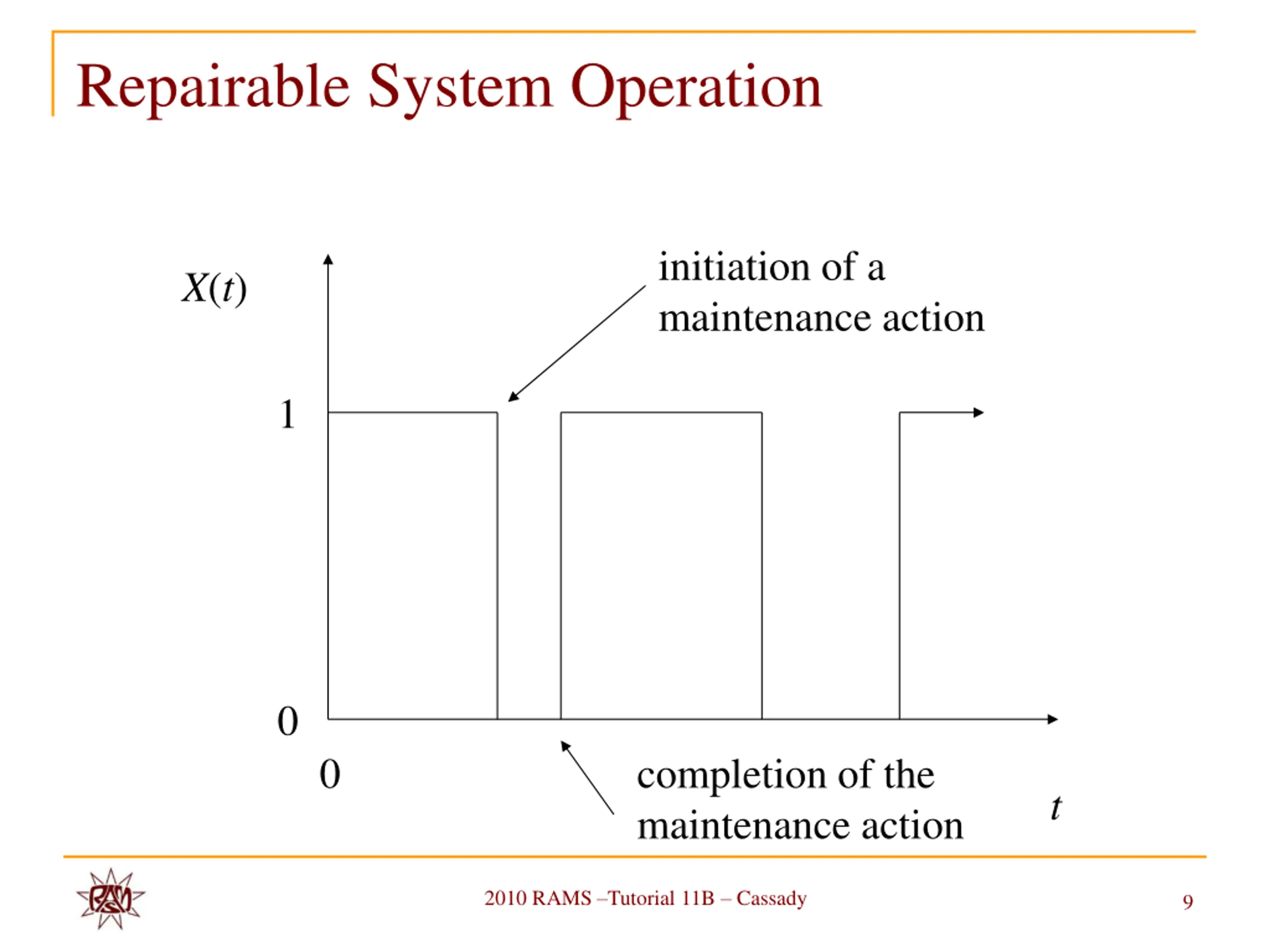 Repairable System Operation initiation of a maintenance action X(t) 1 0 0 completion of the maintenance action t 2010 RAMS Tutorial 11B Cassady 9